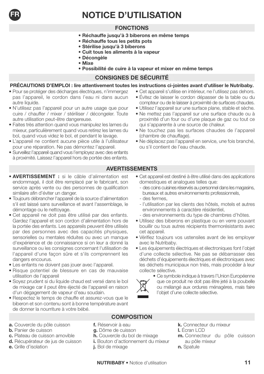 - des coins cuisines réservés au personnel dans les magasins, bureaux et autres environnements professionnels, - des fermes, - l’utilisation par les clients des hôtels, motels et autres environnements à caractère résidentiel, - des environnements du type de chambres d’hôtes. • Utilisez des biberons en plastique ou en verre pouvant bouillir ou tous autres récipients thermorésistants avec cet appareil. • Vérifiez toujours vos ustensiles avant de les employer avec le Nutribaby. • Les équipements électriques et électroniques font l’objet d’une collecte sélective. Ne pas se débarrasser des déchets d’équipements électriques et électroniques avec les déchets municipaux non triés, mais procéder à leur collecte sélective. • Ce symbole indique à travers l’Union Européenne que ce produit ne doit pas être jeté à la poubelle ou mélangé aux ordures ménagères, mais faire l’objet d’une collecte sélective.
