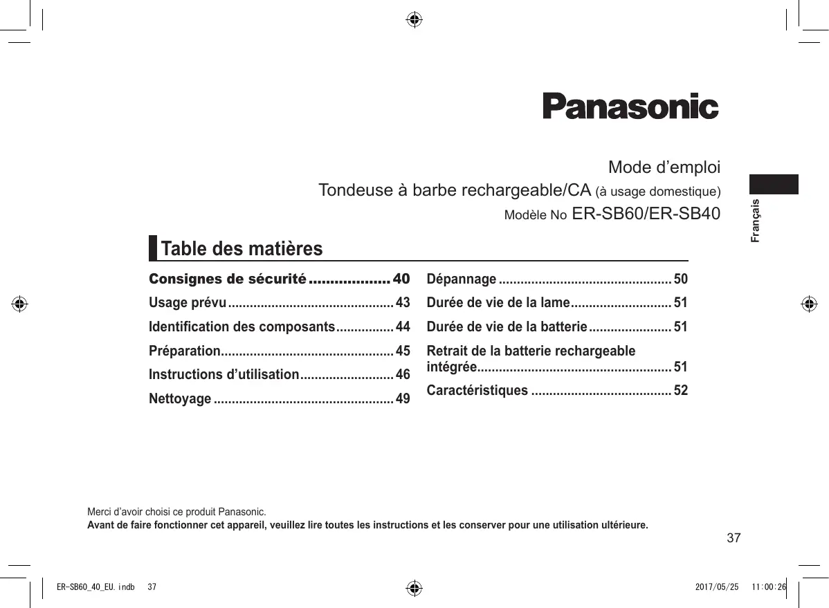 Retrouvez gratuitement la notice de l'appareil ERSB60 PANASONIC au format PDF.