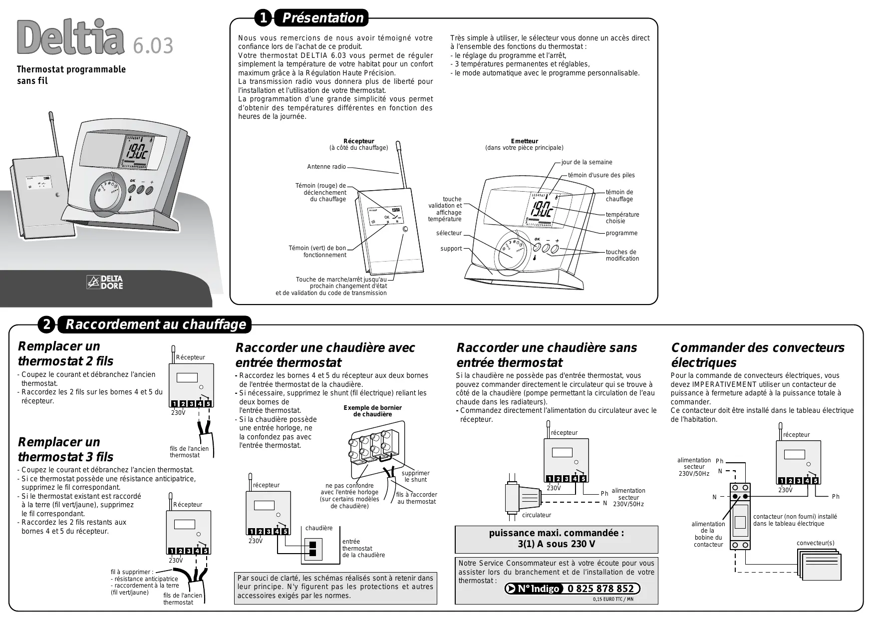 circulateur chaudière 230V fil à supprimer : - résistance anticipatrice - raccordement à la terre (fil vert/jaune) fils de l'ancien thermostat récepteur entrée thermostat de la chaudière Par souci de clarté, les schémas réalisés sont à retenir dans leur principe. N'y figurent pas les protections et autres accessoires exigés par les normes. puissance maxi. commandée : 3(1) A sous 230 V Notre Service Consommateur est à votre écoute pour vous assister lors du branchement et de l’installation de votre thermostat : alimentation de la bobine du contacteur
