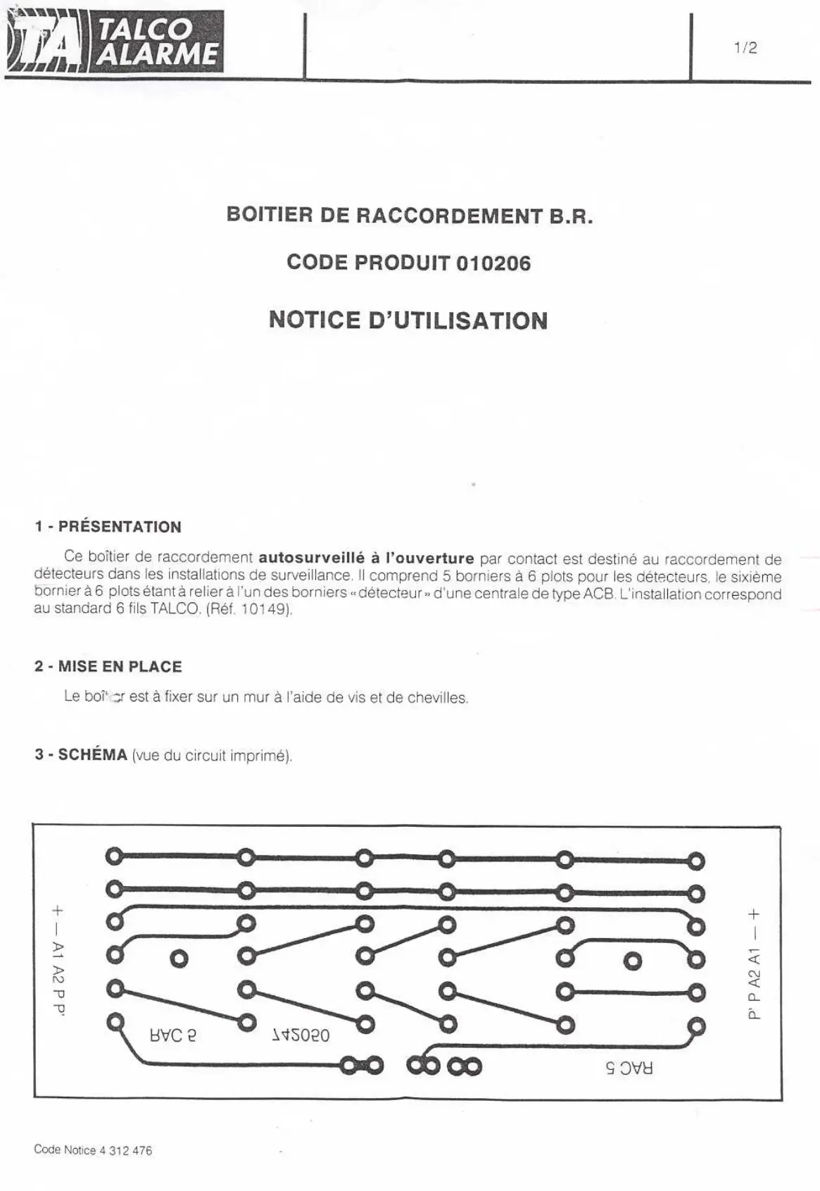 | Configuration des borniers | 5 borniers à 6 plots pour détecteurs, 1 bornier à 6 plots pour centrale |