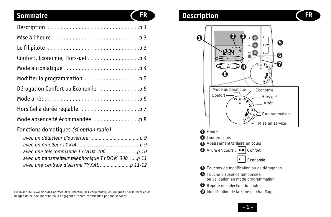 Mode automatique . . . . . . . . . . . . . . . . . . . . . . . .p 4 Mode automatique Confort Economie Hors gel Arrêt Hors Gel à durée réglable . . . . . . . . . . . . . . . . . . .p 7 Programmation Mode absence télécommandée . . . . . . . . . . . . . . .p 8 Fonctions domotiques (si option radio) avec un détecteur d’ouverture .....................................p 9 avec un émetteur TYXIA..............................................p 9 avec une télécommande TYDOM 200 ......................p 10 avec un transmetteur téléphonique TYDOM 300 .....p 11 avec une centrale d’alarme TYXAL ......................p 11-12 Mise en service Heure 2 Jour en cours 3 Abaissement tarifaire en cours 4 Allure en cours : Confort Economie 5 Touches de modification ou de dérogation 6 Touche d'absence temporisée ou validation en mode programmation En raison de l'évolution des normes et du matériel, les caractéristiques indiquées par le texte et les images de ce document ne nous engagent qu'après confirmation par nos services. 7 Repère de sélection du bouton 8 Identification de la zone de chauffage