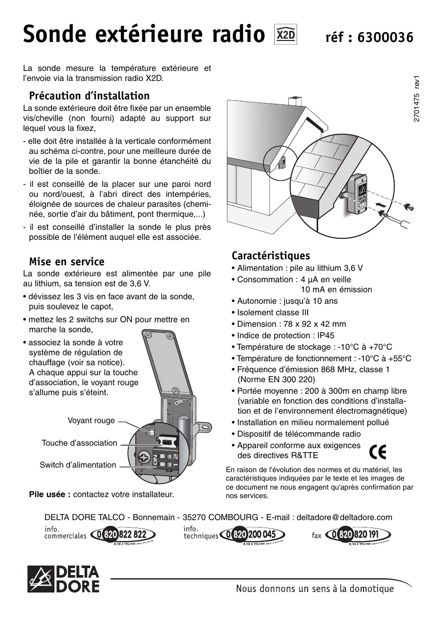 Sonde extérieure radio réf : 6300036 2701475 rev1 La sonde mesure la température extérieure et l’envoie via la transmission radio X2D. Précaution d’installation La sonde extérieure doit être fixée par un ensemble vis/cheville (non fourni) adapté au support sur lequel vous la fixez, - elle doit être installée à la verticale conformément au schéma ci-contre, pour une meilleure durée de vie de la pile et garantir la bonne étanchéité du boîtier de la sonde. - il est conseillé de la placer sur une paroi nord ou nord/ouest, à l’abri direct des intempéries, éloignée de sources de chaleur parasites (cheminée, sortie d’air du bâtiment, pont thermique,...) - il est conseillé d’installer la sonde le plus près possible de l’élément auquel elle est associée. Caractéristiques Mise en service La sonde extérieure est alimentée par une pile au lithium, sa tension est de 3,6 V.