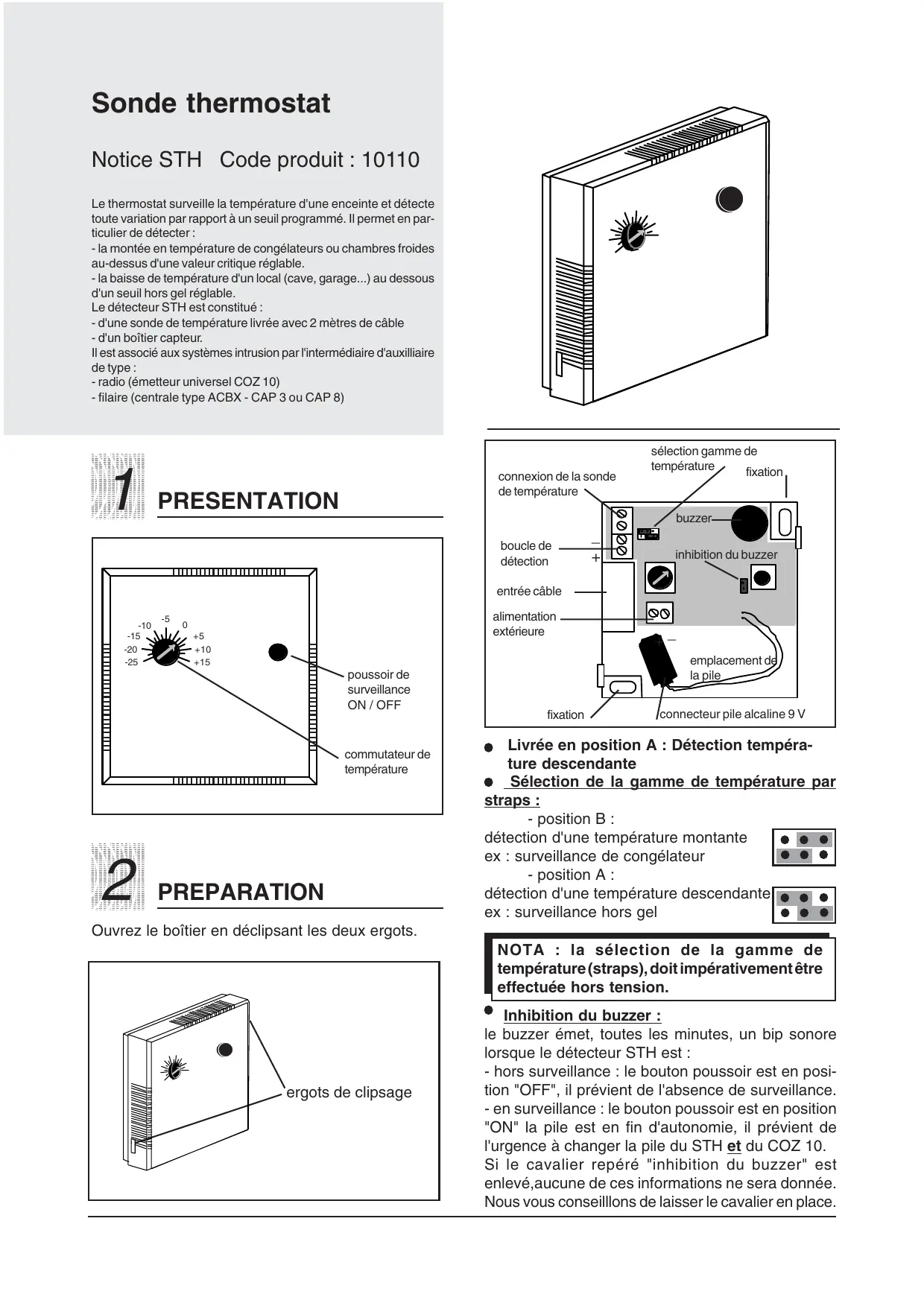Sonde thermostat Notice STH Code produit : 10110 Le thermostat surveille la température d'une enceinte et détecte toute variation par rapport à un seuil programmé. Il permet en particulier de détecter : - la montée en température de congélateurs ou chambres froides au-dessus d'une valeur critique réglable. - la baisse de température d'un local (cave, garage...) au dessous d'un seuil hors gel réglable. Le détecteur STH est constitué : - d'une sonde de température livrée avec 2 mètres de câble - d'un boîtier capteur. Il est associé aux systèmes intrusion par l'intermédiaire d'auxilliaire de type : - radio (émetteur universel COZ 10) - filaire (centrale type ACBX - CAP 3 ou CAP 8)