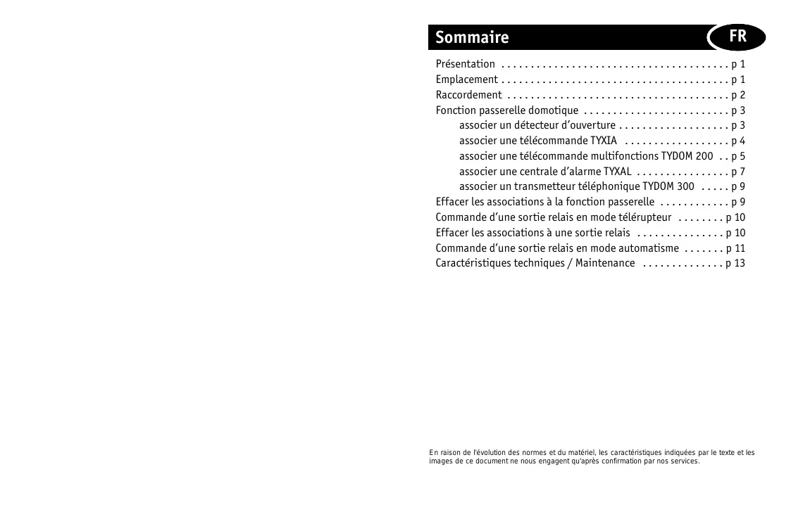 Présentation . . . . . . . . . . . . . . . . . . . . . . . . . . . . . . . . . . . . . . . p 1 Emplacement . . . . . . . . . . . . . . . . . . . . . . . . . . . . . . . . . . . . . . . p 1 Raccordement . . . . . . . . . . . . . . . . . . . . . . . . . . . . . . . . . . . . . . p 2 Fonction passerelle domotique . . . . . . . . . . . . . . . . . . . . . . . . . p 3 associer un détecteur d’ouverture . . . . . . . . . . . . . . . . . . . p 3 associer une télécommande TYXIA . . . . . . . . . . . . . . . . . . p 4 associer une télécommande multifonctions TYDOM 200 . . p 5 associer une centrale d’alarme TYXAL . . . . . . . . . . . . . . . . p 7 associer un transmetteur téléphonique TYDOM 300 . . . . . p 9 Effacer les associations à la fonction passerelle . . . . . . . . . . . . p 9 Commande d’une sortie relais en mode télérupteur . . . . . . . . p 10 Effacer les associations à une sortie relais . . . . . . . . . . . . . . . p 10 Commande d’une sortie relais en mode automatisme . . . . . . . p 11 Caractéristiques techniques / Maintenance . . . . . . . . . . . . . . p 13 En raison de l'évolution des normes et du matériel, les caractéristiques indiquées par le texte et les images de ce document ne nous engagent qu'après confirmation par nos services. Présentation