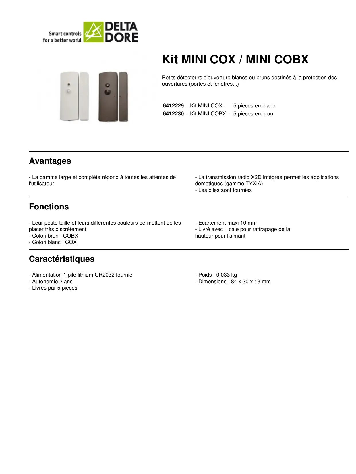 Kit MINI COX / MINI COBX Petits détecteurs d'ouverture blancs ou bruns destinés à la protection des ouvertures (portes et fenêtres...) 6412229 - Kit MINI COX - 5 pièces en blanc 6412230 - Kit MINI COBX - 5 pièces en brun Avantages - La gamme large et complète répond à toutes les attentes de l'utilisateur - La transmission radio X2D intégrée permet les applications domotiques (gamme TYXIA) - Les piles sont fournies Fonctions - Leur petite taille et leurs différentes couleurs permettent de les placer très discrètement - Colori brun : COBX - Colori blanc : COX - Ecartement maxi 10 mm - Livré avec 1 cale pour rattrapage de la hauteur pour l'aimant Caractéristiques - Alimentation 1 pile lithium CR2032 fournie - Autonomie 2 ans - Livrés par 5 pièces - Poids : 0,033 kg - Dimensions : 84 x 30 x 13 mm