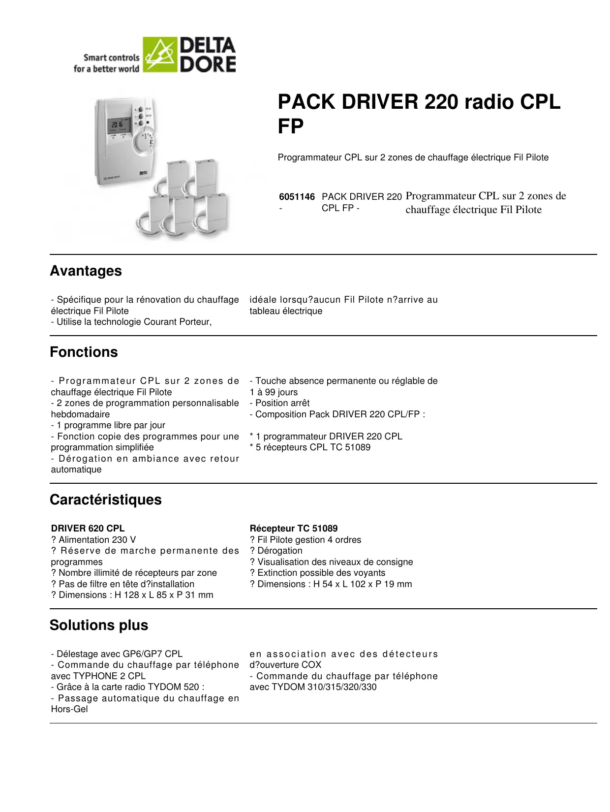 - 5 récepteurs CPL TC 51089 Caractéristiques DRIVER 620 CPL ? Alimentation 230 V ? Réserve de marche permanente des programmes ? Nombre illimité de récepteurs par zone ? Pas de filtre en tête d?installation ? Dimensions : H 128 x L 85 x P 31 mm Récepteur TC 51089 ? Fil Pilote gestion 4 ordres ? Dérogation ? Visualisation des niveaux de consigne ? Extinction possible des voyants ? Dimensions : H 54 x L 102 x P 19 mm Solutions plus - Délestage avec GP6/GP7 CPL - Commande du chauffage par téléphone avec TYPHONE 2 CPL - Grâce à la carte radio TYDOM 520 : - Passage automatique du chauffage en Hors-Gel en association avec des détecteurs d?ouverture COX - Commande du chauffage par téléphone avec TYDOM 310/315/320/330 Schéma