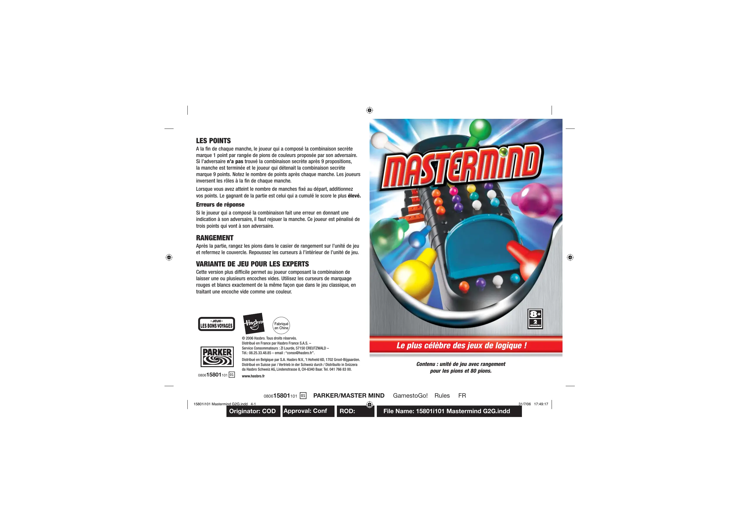 Le plus célèbre des jeux de logique ! Distribué en Belgique par S.A. Hasbro N.V., ’t Hofveld 6D, 1702 Groot-Bijgaarden. Distribué en Suisse par / Vertrieb in der Schweiz durch / Distribuito in Svizzera da Hasbro Schweiz AG, Lindenstrasse 8, CH-6340 Baar. Tel. 041 766 83 00. Contenu : unité de jeu avec rangement pour les pions et 80 pions. www.hasbro.fr