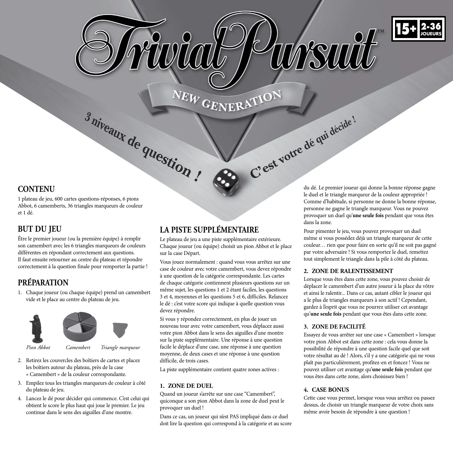 15+ 2-36 JOUEURS CONTENU 1 plateau de jeu, 600 cartes questions-réponses, 6 pions Abbot, 6 camemberts, 36 triangles marqueurs de couleur et 1 dé.