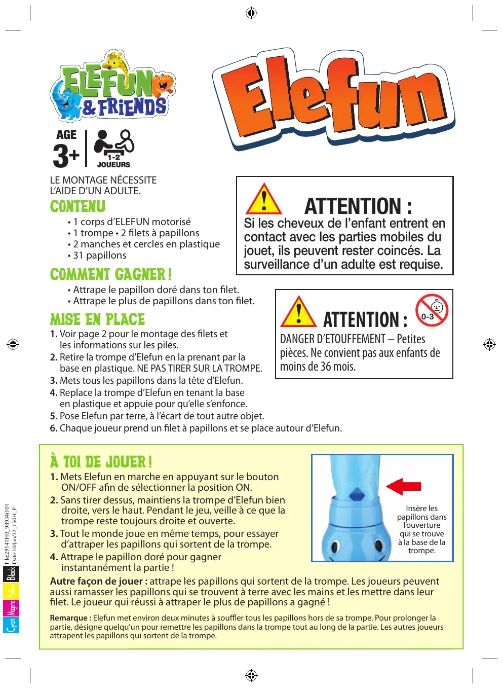 instantanément la partie ! Autre façon de jouer : attrape les papillons qui sortent de la trompe. Les joueurs peuvent aussi ramasser les papillons qui se trouvent à terre avec les mains et les mettre dans leur filet. Le joueur qui réussi à attraper le plus de papillons a gagné ! Remarque : Elefun met environ deux minutes à souffler tous les papillons hors de sa trompe. Pour prolonger la partie, désigne quelqu’un pour remettre les papillons dans la trompe tout au long de la partie. Les autres joueurs attrapent les papillons qui sortent de la trompe.
