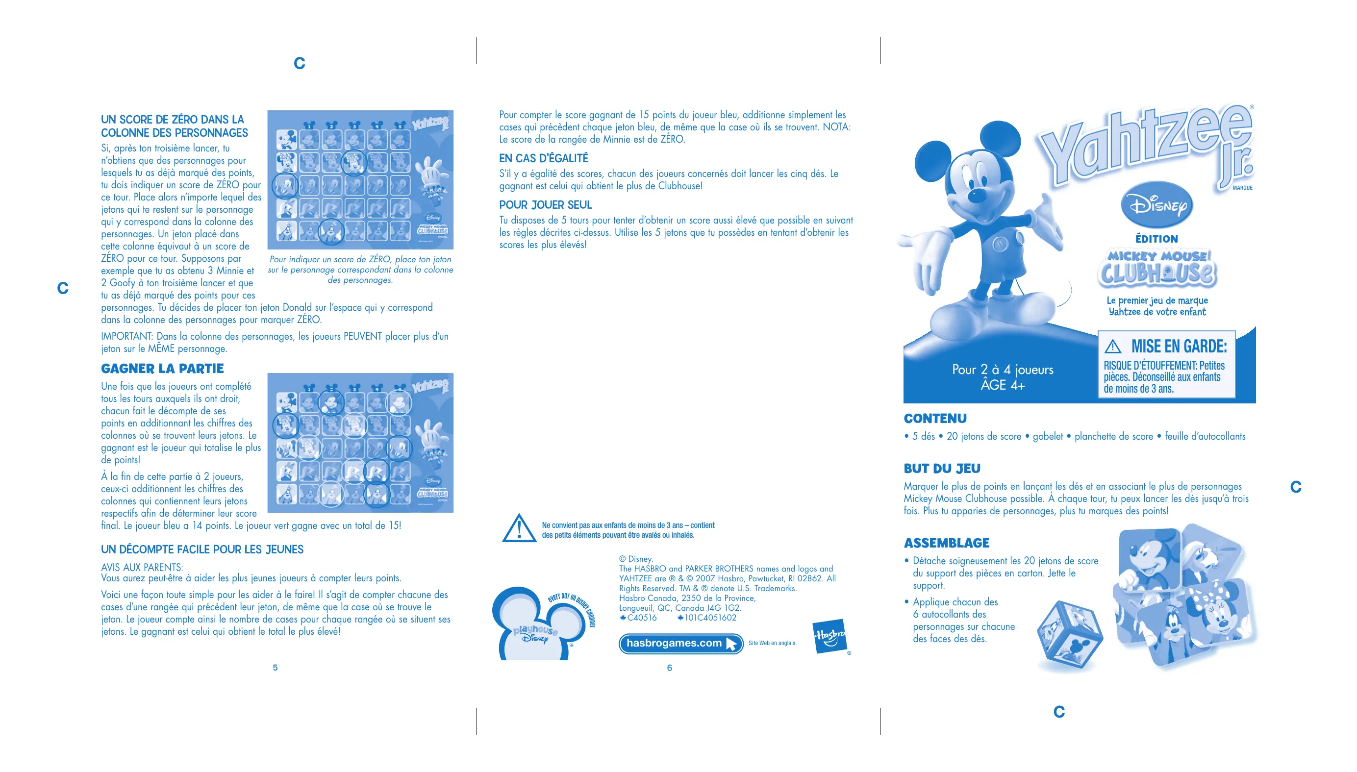 YAHTZEE JR MICKEY MOUSE CLUBHOUSE - Jeux de société HASBRO - Notice d'utilisation et mode d'emploi gratuit