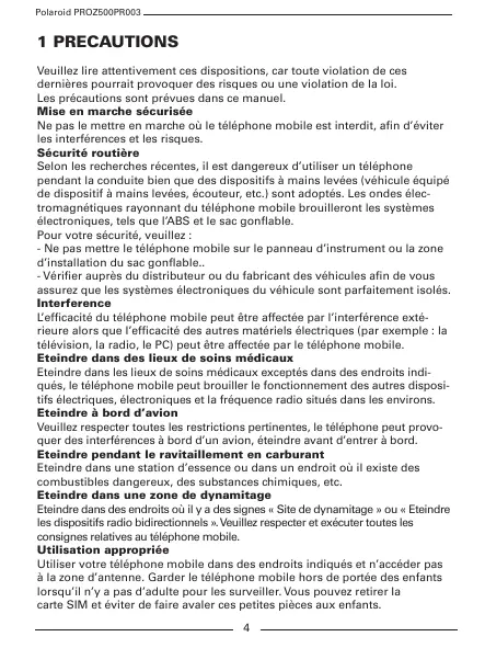 Polaroid PROZ500PR003 1 Precautions Veuillez lire attentivement ces dispositions, car toute violation de ces dernières pourrait provoquer des risques ou une violation de la loi. Les précautions sont prévues dans ce manuel. Mise en marche sécurisée Ne pas le mettre en marche où le téléphone mobile est interdit, afin d’éviter les interférences et les risques. Sécurité routière Selon les recherches récentes, il est dangereux d’utiliser un téléphone pendant la conduite bien que des dispositifs à mains levées (véhicule équipé de dispositif à mains levées, écouteur, etc.) sont adoptés. Les ondes électromagnétiques rayonnant du téléphone mobile brouilleront les systèmes électroniques, tels que l’ABS et le sac gonflable. Pour votre sécurité, veuillez : - Ne pas mettre le téléphone mobile sur le panneau d’instrument ou la zone d’installation du sac gonflable.. - Vérifier auprès du distributeur ou du fabricant des véhicules afin de vous assurez que les systèmes électroniques du véhicule sont parfaitement isolés. Interference L’efficacité du téléphone mobile peut être affectée par l’interférence extérieure alors que l’efficacité des autres matériels électriques (par exemple : la télévision, la radio, le PC) peut être affectée par le téléphone mobile. Eteindre dans des lieux de soins médicaux Eteindre dans les lieux de soins médicaux exceptés dans des endroits indiqués, le téléphone mobile peut brouiller le fonctionnement des autres dispositifs électriques, électroniques et la fréquence radio situés dans les environs. Eteindre à bord d’avion Veuillez respecter toutes les restrictions pertinentes, le téléphone peut provoquer des interférences à bord d’un avion, éteindre avant d’entrer à bord. Eteindre pendant le ravitaillement en carburant Eteindre dans une station d’essence ou dans un endroit où il existe des combustibles dangereux, des substances chimiques, etc. Eteindre dans une zone de dynamitage Eteindre dans des endroits où il y a des signes « Site de dynamitage » ou « Eteindre les dispositifs radio bidirectionnels ». Veuillez respecter et exécuter toutes les consignes relatives au téléphone mobile. Utilisation appropriée Utiliser votre téléphone mobile dans des endroits indiqués et n’accéder pas à la zone d’antenne. Garder le téléphone mobile hors de portée des enfants lorsqu’il n’y a pas d’adulte pour les surveiller. Vous pouvez retirer la carte SIM et éviter de faire avaler ces petites pièces aux enfants.