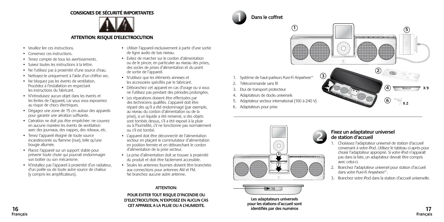 2. Branchez l’adaptateur universel pour station d’accueil dans votre Pure-Fi Anywhere™. 3. Branchez votre iPod dans la station d’accueil universelle.