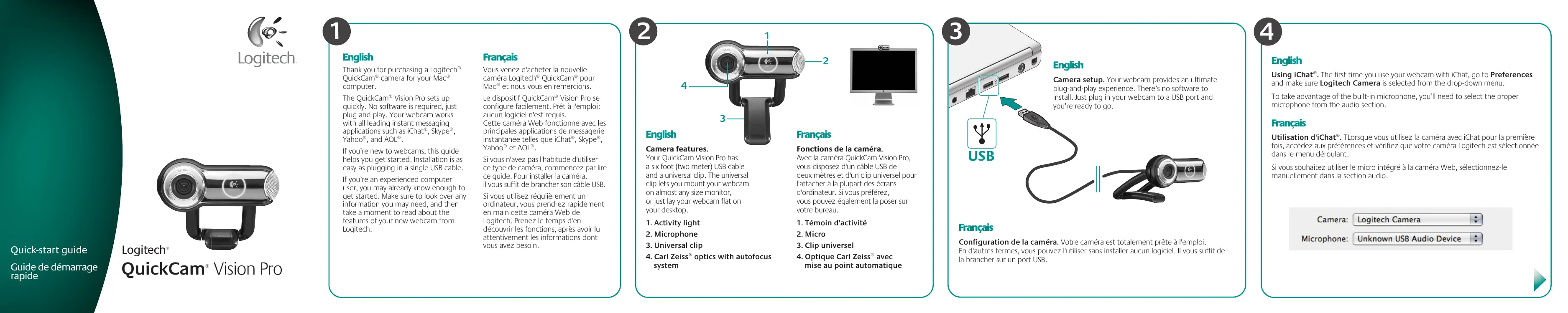 mise au point automatique English Using iChat®. The first time you use your webcam with iChat, go to Preferences and make sure Logitech Camera is selected from the drop-down menu. To take advantage of the built-in microphone, you’ll need to select the proper microphone from the audio section. Français USB Français Configuration de la caméra. Votre caméra est totalement prête à l'emploi. En d'autres termes, vous pouvez l'utiliser sans installer aucun logiciel. Il vous suffit de la brancher sur un port USB. Utilisation d'iChat®. TLorsque vous utilisez la caméra avec iChat pour la première fois, accédez aux préférences et vérifiez que votre caméra Logitech est sélectionnée dans le menu déroulant. Si vous souhaitez utiliser le micro intégré à la caméra Web, sélectionnez-le manuellement dans la section audio.