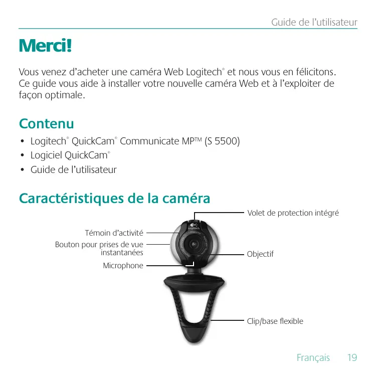- Português User’s Guide Guide de l’utilisateur Merci! Vous venez d’acheter une caméra Web Logitech® et nous vous en félicitons. Ce guide vous aide à installer votre nouvelle caméra Web et à l’exploiter de façon optimale. Contenu p. 27
