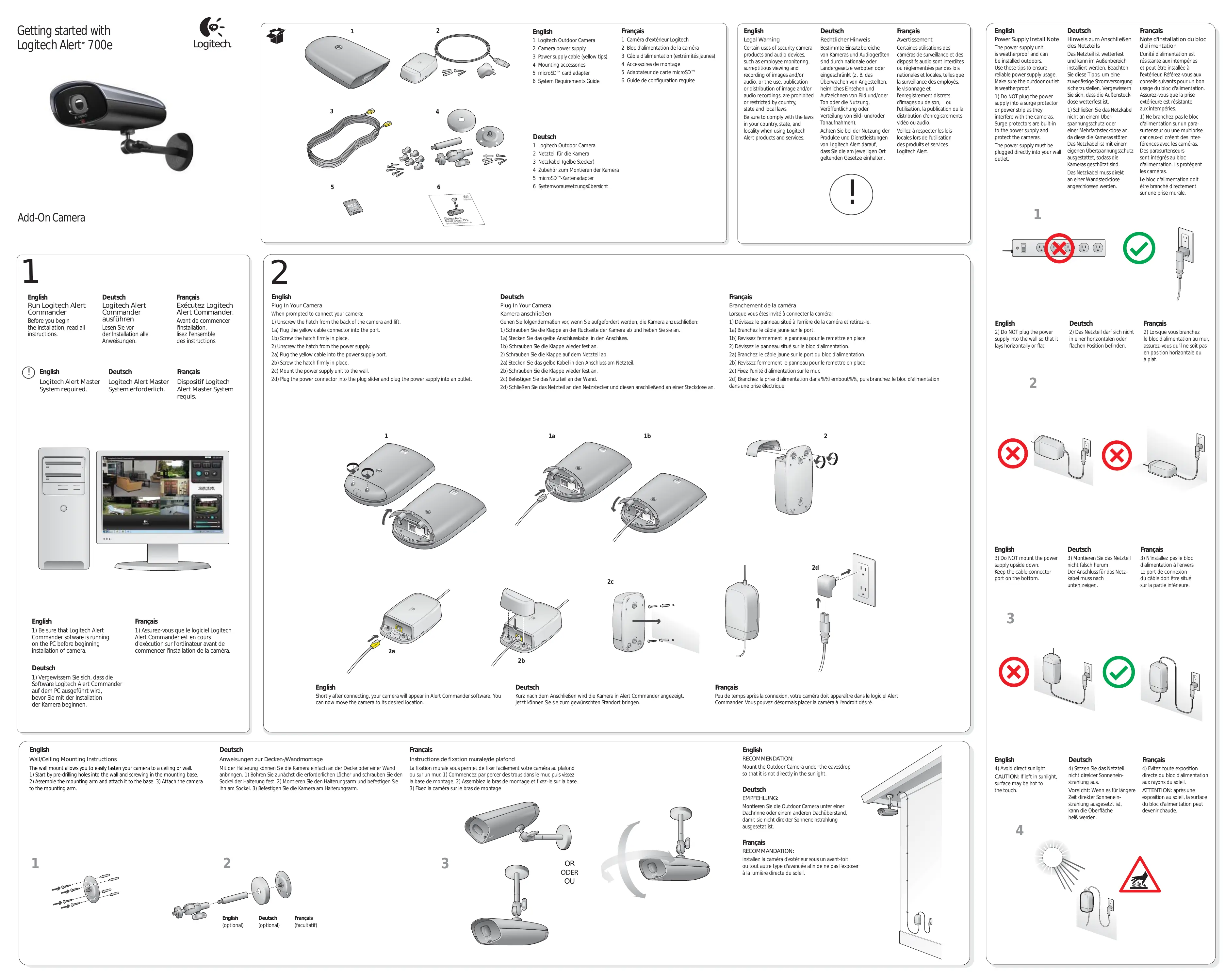 d'alimentation sur un parasurtenseur ou une multiprise car ceux-ci créent des interférences avec les caméras. Des parasurtenseurs sont intégrés au bloc d'alimentation. Ils protègent les caméras. Le bloc d'alimentation doit être branché directement sur une prise murale. Logitech Outdoor Camera Camera power supply Power supply cable (yellow tips) Mounting accessories microSD™ card adapter System Requirements Guide Caméra d'extérieur Logitech Bloc d'alimentation de la caméra Câble d'alimentation (extrémités jaunes) Accessoires de montage Adaptateur de carte microSD™ Guide de configuration requise