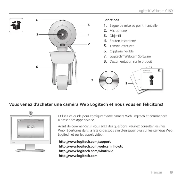 Bague de mise au point manuelle Microphone Objectif Bouton Instantané Témoin d'activité Clip/base flexible Logitech® Webcam Software Documentation sur le produit (FUUJOHTUBSUFEXJUI Première utilisation -PHJUFDI 8FCDBN$ Vous venez d'acheter une caméra Web Logitech et nous vous en félicitons! Utilisez ce guide pour configurer votre caméra Web Logitech et commencer à passer des appels vidéo. Avant de commencer, si vous avez des questions, veuillez consulter les sites Web répertoriés dans la liste ci-dessous afin d'en savoir plus sur les caméras Web Logitech et sur les appels vidéo. Français 19 Première utilisation Configuration de votre caméra Web