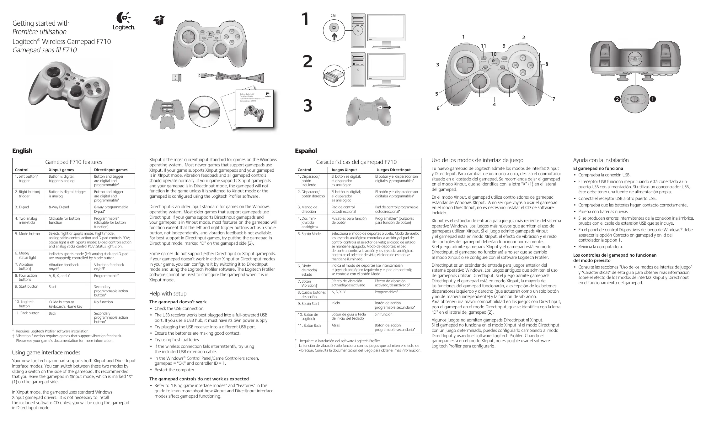 - Reportez-vous aux sections Utilisation des modes d'interface de jeu et Fonctionnalités pour en savoir plus sur les modes XInput et DirectInput affectant le fonctionnement du gamepad. United States +1 646-454-3200 Argentina +0800 555 3284 What do you think? ¿Cuál es su opinión? Qu'en pensez-vous? O que você acha? Brasil +0800 891 4173 Please take a minute to tell us. Thank you for purchasing our product. © 2011 Logitech. Logitech, the Logitech logo, and other Logitech marks are owned by Logitech and may be registered. I-FORCE™ Force Feedback Technology Licensed from Immersion Corporation. All other trademarks are the property of their respective owners. Logitech assumes no responsibility for any errors that may appear in this manual. Information contained herein is subject to change without notice. Canada +1-866-934-5644 Nos gustaría conocerla, si puede dedicarnos un minuto. Le agradecemos la adquisición de nuestro producto. Chile