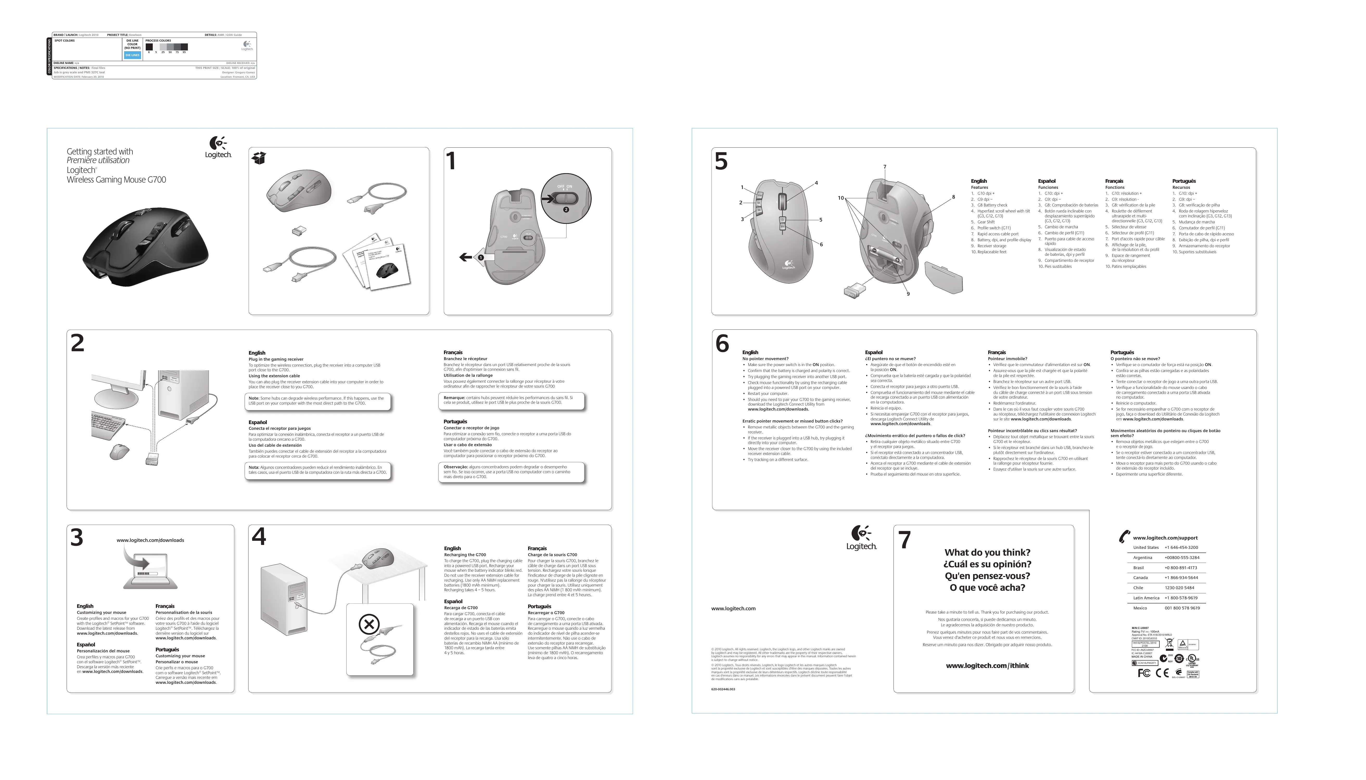 www.logitech.com www.logitech.com/support What do you think? ¿Cuál es su opinión? Qu'en pensez-vous? O que você acha? Please take a minute to tell us. Thank you for purchasing our product. Nos gustaría conocerla, si puede dedicarnos un minuto. Le agradecemos la adquisición de nuestro producto. Prenez quelques minutes pour nous faire part de vos commentaires. Vous venez d'acheter ce produit et nous vous en remercions. Reserve um minuto para nos dizer. Obrigado por adquirir nosso produto. © 2010 Logitech. All rights reserved. Logitech, the Logitech logo, and other Logitech marks are owned by Logitech and may be registered. All other trademarks are the property of their respective owners. Logitech assumes no responsibility for any errors that may appear in this manual. Information contained herein is subject to change without notice. © 2010 Logitech. Tous droits réservés. Logitech, le logo Logitech et les autres marques Logitech sont la propriété exclusive de Logitech et sont susceptibles d’être des marques déposées. Toutes les autres marques sont la propriété exclusive de leurs détenteurs respectifs. Logitech décline toute responsabilité en cas d'erreurs dans ce manuel. Les informations énoncées dans le présent document peuvent faire l’objet de modifications sans avis préalable. 620-002446.003 United States +1 646-454-3200 Argentina +00800-555-3284 Brasil +0 800-891-4173 Canada +1 866-934-5644 Chile
