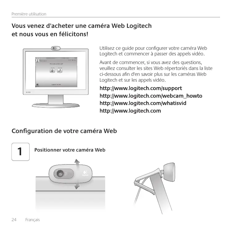 Utilisez ce guide pour configurer votre caméra Web Logitech et commencer à passer des appels vidéo. Avant de commencer, si vous avez des questions, veuillez consulter les sites Web répertoriés dans la liste ci-dessous afin d'en savoir plus sur les caméras Web Logitech et sur les appels vidéo.