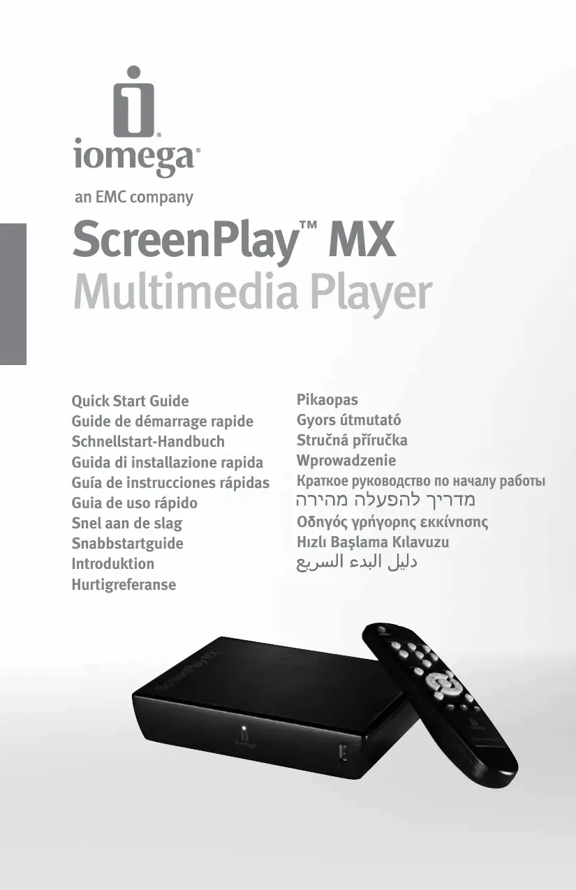 - Make sure the batteries in the remote control are good. If needed, install two fresh AAA batteries. Make sure the batteries are oriented correctly. For additional troubleshooting help, visit the support area on www.iomega.com. Open Source Software The software included in this product contains copyrighted software that is licensed under open source agreements. Components of this software covered under GPL or other open source licenses are fully documented as to license and redistribution requirements in the ReadMe file provided with the software. A copy of this ReadMe may, at Iomega’s discretion and subject to change at any time, be available on Iomega’s Support and Download site at www.iomega. com/support. You may download the corresponding source code (when source code distribution is required) from the Iomega web site at www.iomega.com/support. To locate the download page for open source code, select your Iomega product and your operating system. Scroll down the page to the search field and enter “open source.” In addition, you can also obtain a copy of the applicable open source code on CD by sending a money order or check for $10 to: Iomega Corporation, ATTN: Source Code, 4059 South 1900 West, Roy, UT 84067 USA Please include the model name for your ScreenPlay product with the request. Complete User's Manual A complete user’s manual in HTML format is available on the support area on www.iomega.com. The manual includes additional information on installation, setup options, troubleshooting, and using the ScreenPlay MX player and remote control. You can view the manual online or download it to your computer. The manual is available in English, French, German, Italian, Spanish, Portuguese, Dutch, Russian, and Chinese Simplified. Prise en main Votre lecteur multimédia ScreenPlay MX est facile à utiliser. Voici comment procéder pour la prise en main : A. Connectez le ScreenPlay MX à l’ordinateur pour transférer les fichiers et organiser votre bibliothèque multimédia. B. Mettez le ScreenPlay MX hors tension, déconnectez-le de l’ordinateur et connectez-le au téléviseur. REMARQUE : ne connectez pas le ScreenPlay MX à l’ordinateur et au téléviseur en même temps. Si le ScreenPlay MX est sous tension et connecté aux deux, USB démarre en premier et l’interface du téléviseur affiche uniquement l’écran de démarrage. La seconde connexion n’est alors pas reconnue. C. Activez le ScreenPlay MX et diffusez vos fichiers multimédia sur le téléviseur. Reportez-vous aux instructions détaillées ci-dessous. Chargement de fichiers multimédia sur le ScreenPlay MX