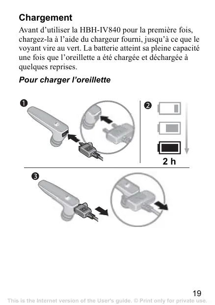 Chargement Avant d’utiliser la HBH-IV840 pour la première fois, chargez-la à l’aide du chargeur fourni, jusqu’à ce que le voyant vire au vert. La batterie atteint sa pleine capacité une fois que l’oreillette a été chargée et déchargée à quelques reprises. Pour charger l’oreillette
