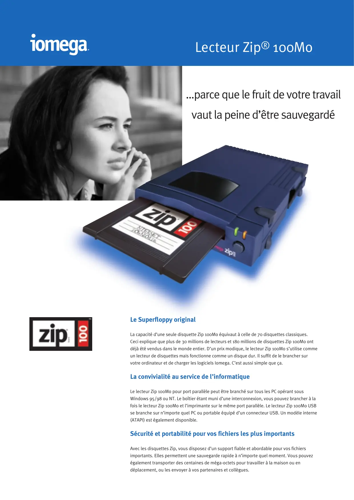 Lecteur Zip® 100Mo ...parce que le fruit de votre travail vaut la peine d’être sauvegardé Le Superfloppy original La capacité d’une seule disquette Zip 100Mo équivaut à celle de 70 disquettes classiques. Ceci explique que plus de 30 millions de lecteurs et 180 millions de disquettes Zip 100Mo ont déjà été vendus dans le monde entier. D’un prix modique, le lecteur Zip 100Mo s’utilise comme un lecteur de disquettes mais fonctionne comme un disque dur. Il suffit de le brancher sur votre ordinateur et de charger les logiciels Iomega. C’est aussi simple que ça. La convivialité au service de l’informatique Le lecteur Zip 100Mo pour port parallèle peut être branché sur tous les PC opérant sous Windows 95/98 ou NT. Le boîtier étant muni d’une interconnexion, vous pouvez brancher à la fois le lecteur Zip 100Mo et l’imprimante sur le même port parallèle. Le lecteur Zip 100Mo USB se branche sur n’importe quel PC ou portable équipé d’un connecteur USB. Un modèle interne (ATAPI) est également disponible. Sécurité et portabilité pour vos fichiers les plus importants Avec les disquettes Zip, vous disposez d’un support fiable et abordable pour vos fichiers importants. Elles permettent une sauvegarde rapide à n’importe quel moment. Vous pouvez également transporter des centaines de méga-octets pour travailler à la maison ou en déplacement, ou les envoyer à vos partenaires et collègues. Lecteur Zip® 100Mo CARACTERISTIQUES :