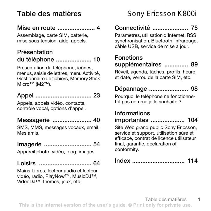 - Site Web grand public Sony Ericsson, service et support, utilisation sûre et efficace, contrat de licence utilisateur final, garantie, declaration of conformity. Index Mains Libres, lecteur audio et lecteur vidéo, radio, PlayNow™, MusicDJ™, VideoDJ™, thèmes, jeux, etc. Table des matières This is the Internet version of the user's guide. © Print only for private use. p. 114