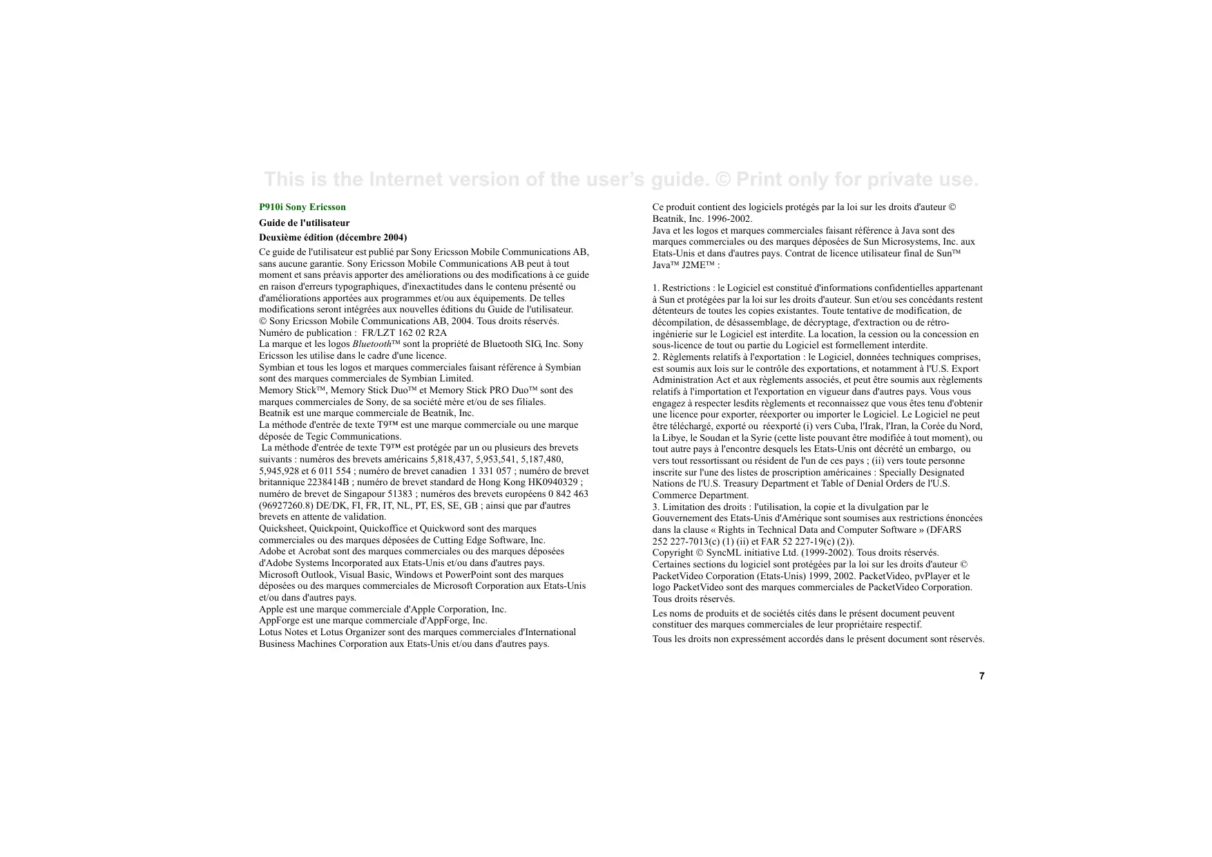 Glossaire .................................................................. 218 Spécifications techniques........................................ 227 Index......................................................................... 232 This is the Internet version of the user’s guide. © Print only for private use. P910i Sony Ericsson Guide de l'utilisateur Deuxième édition (décembre 2004) Ce guide de l'utilisateur est publié par Sony Ericsson Mobile Communications AB, sans aucune garantie. Sony Ericsson Mobile Communications AB peut à tout moment et sans préavis apporter des améliorations ou des modifications à ce guide en raison d'erreurs typographiques, d'inexactitudes dans le contenu présenté ou d'améliorations apportées aux programmes et/ou aux équipements. De telles modifications seront intégrées aux nouvelles éditions du Guide de l'utilisateur. © Sony Ericsson Mobile Communications AB, 2004. Tous droits réservés. Numéro de publication : FR/LZT 162 02 R2A La marque et les logos Bluetooth™ sont la propriété de Bluetooth SIG, Inc. Sony Ericsson les utilise dans le cadre d'une licence. Symbian et tous les logos et marques commerciales faisant référence à Symbian sont des marques commerciales de Symbian Limited. Memory Stick™, Memory Stick Duo™ et Memory Stick PRO Duo™ sont des marques commerciales de Sony, de sa société mère et/ou de ses filiales. Beatnik est une marque commerciale de Beatnik, Inc. La méthode d'entrée de texte T9™ est une marque commerciale ou une marque déposée de Tegic Communications. La méthode d'entrée de texte T9™ est protégée par un ou plusieurs des brevets suivants : numéros des brevets américains 5,818,437, 5,953,541, 5,187,480, 5,945,928 et 6 011 554 ; numéro de brevet canadien 1 331 057 ; numéro de brevet britannique 2238414B ; numéro de brevet standard de Hong Kong HK0940329 ; numéro de brevet de Singapour 51383 ; numéros des brevets européens 0 842 463 (96927260.8) DE/DK, FI, FR, IT, NL, PT, ES, SE, GB ; ainsi que par d'autres brevets en attente de validation. Quicksheet, Quickpoint, Quickoffice et Quickword sont des marques commerciales ou des marques déposées de Cutting Edge Software, Inc. Adobe et Acrobat sont des marques commerciales ou des marques déposées d'Adobe Systems Incorporated aux Etats-Unis et/ou dans d'autres pays. Microsoft Outlook, Visual Basic, Windows et PowerPoint sont des marques déposées ou des marques commerciales de Microsoft Corporation aux Etats-Unis et/ou dans d'autres pays. Apple est une marque commerciale d'Apple Corporation, Inc. AppForge est une marque commerciale d'AppForge, Inc. Lotus Notes et Lotus Organizer sont des marques commerciales d'International Business Machines Corporation aux Etats-Unis et/ou dans d'autres pays. Ce produit contient des logiciels protégés par la loi sur les droits d'auteur © Beatnik, Inc. 1996-2002. Java et les logos et marques commerciales faisant référence à Java sont des marques commerciales ou des marques déposées de Sun Microsystems, Inc. aux Etats-Unis et dans d'autres pays. Contrat de licence utilisateur final de Sun™ Java™ J2ME™ :