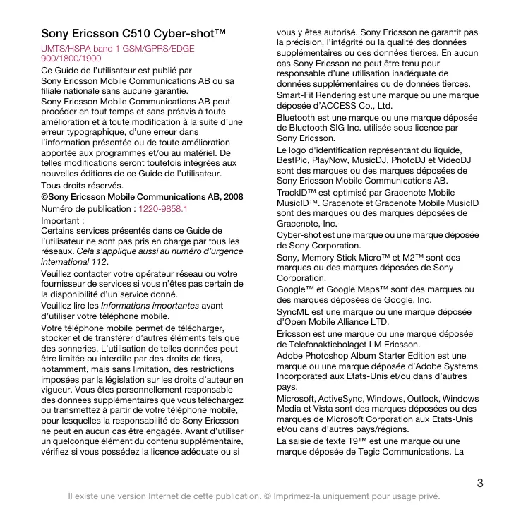 - Tâches Il existe une version Internet de cette publication. © Imprimez-la uniquement pour usage privé. Sony Ericsson C510 Cyber-shot™ UMTS/HSPA band 1 GSM/GPRS/EDGE 900/1800/1900 Ce Guide de l’utilisateur est publié par Sony Ericsson Mobile Communications AB ou sa filiale nationale sans aucune garantie. Sony Ericsson Mobile Communications AB peut procéder en tout temps et sans préavis à toute amélioration et à toute modification à la suite d’une erreur typographique, d’une erreur dans l’information présentée ou de toute amélioration apportée aux programmes et/ou au matériel. De telles modifications seront toutefois intégrées aux nouvelles éditions de ce Guide de l’utilisateur. Tous droits réservés. ©Sony Ericsson Mobile Communications AB, 2008 Numéro de publication : 1220-9858.1 Important : Certains services présentés dans ce Guide de l’utilisateur ne sont pas pris en charge par tous les réseaux. Cela s’applique aussi au numéro d’urgence international 112. Veuillez contacter votre opérateur réseau ou votre fournisseur de services si vous n’êtes pas certain de la disponibilité d’un service donné. Veuillez lire les Informations importantes avant d’utiliser votre téléphone mobile. Votre téléphone mobile permet de télécharger, stocker et de transférer d’autres éléments tels que des sonneries. L’utilisation de telles données peut être limitée ou interdite par des droits de tiers, notamment, mais sans limitation, des restrictions imposées par la législation sur les droits d’auteur en vigueur. Vous êtes personnellement responsable des données supplémentaires que vous téléchargez ou transmettez à partir de votre téléphone mobile, pour lesquelles la responsabilité de Sony Ericsson ne peut en aucun cas être engagée. Avant d’utiliser un quelconque élément du contenu supplémentaire, vérifiez si vous possédez la licence adéquate ou si vous y êtes autorisé. Sony Ericsson ne garantit pas la précision, l’intégrité ou la qualité des données supplémentaires ou des données tierces. En aucun cas Sony Ericsson ne peut être tenu pour responsable d’une utilisation inadéquate de données supplémentaires ou de données tierces. Smart-Fit Rendering est une marque ou une marque déposée d’ACCESS Co., Ltd. Bluetooth est une marque ou une marque déposée de Bluetooth SIG Inc. utilisée sous licence par Sony Ericsson. Le logo d'identification représentant du liquide, BestPic, PlayNow, MusicDJ, PhotoDJ et VideoDJ sont des marques ou des marques déposées de Sony Ericsson Mobile Communications AB. TrackID™ est optimisé par Gracenote Mobile MusicID™. Gracenote et Gracenote Mobile MusicID sont des marques ou des marques déposées de Gracenote, Inc. Cyber-shot est une marque ou une marque déposée de Sony Corporation. Sony, Memory Stick Micro™ et M2™ sont des marques ou des marques déposées de Sony Corporation. Google™ et Google Maps™ sont des marques ou des marques déposées de Google, Inc. SyncML est une marque ou une marque déposée d’Open Mobile Alliance LTD. Ericsson est une marque ou une marque déposée de Telefonaktiebolaget LM Ericsson. Adobe Photoshop Album Starter Edition est une marque ou une marque déposée d’Adobe Systems Incorporated aux Etats-Unis et/ou dans d’autres pays. Microsoft, ActiveSync, Windows, Outlook, Windows Media et Vista sont des marques déposées ou des marques de Microsoft Corporation aux Etats-Unis et/ou dans d’autres pays/régions. La saisie de texte T9™ est une marque ou une marque déposée de Tegic Communications. La p. 66