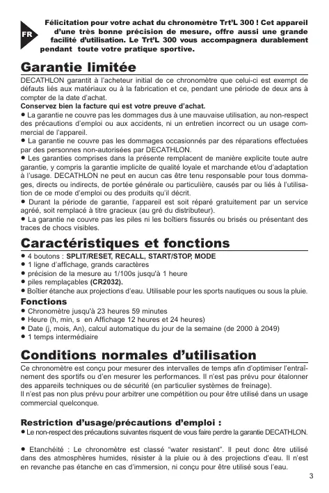 • Le non-respect des précautions suivantes risquent de vous faire perdre la garantie DECATHLON. • Etanchéité : Le chronomètre est classé “water resistant”. Il peut donc être utilisé dans des atmosphères humides, résister à la pluie ou à des projections d’eau. Il n’est en revanche pas étanche en cas d’immersion, ni conçu pour être utilisé sous l’eau. 3
