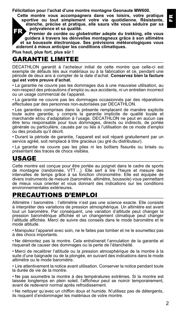 Félicitation pour l’achat d’une montre montagne Geonaute MW600. Cette montre vous accompagnera dans vos loisirs, votre pratique sportive ou tout simplement votre vie quotidienne. Résistante, étanche, précise et pratique, elle saura vite vous séduire par sa polyvalence et sa qualité. FR Premier de cordée ou globetrotter adepte du trekking, elle vous guidera à travers les dénivelles montagneux grâce à son altimètre et sa boussole électronique. Ses prévisions météorologiques vous aideront à mieux anticiper les conditions climatiques. Plus haut, plus fort, plus sûr ! GARANTIE LIMITEE DECATHLON garantit à l’acheteur initial de cette montre que celle-ci est exempte de défauts liés aux matériaux ou à la fabrication et ce, pendant une période de deux ans à compter de la date d’achat. Conservez bien la facture qui est votre preuve d’achat.