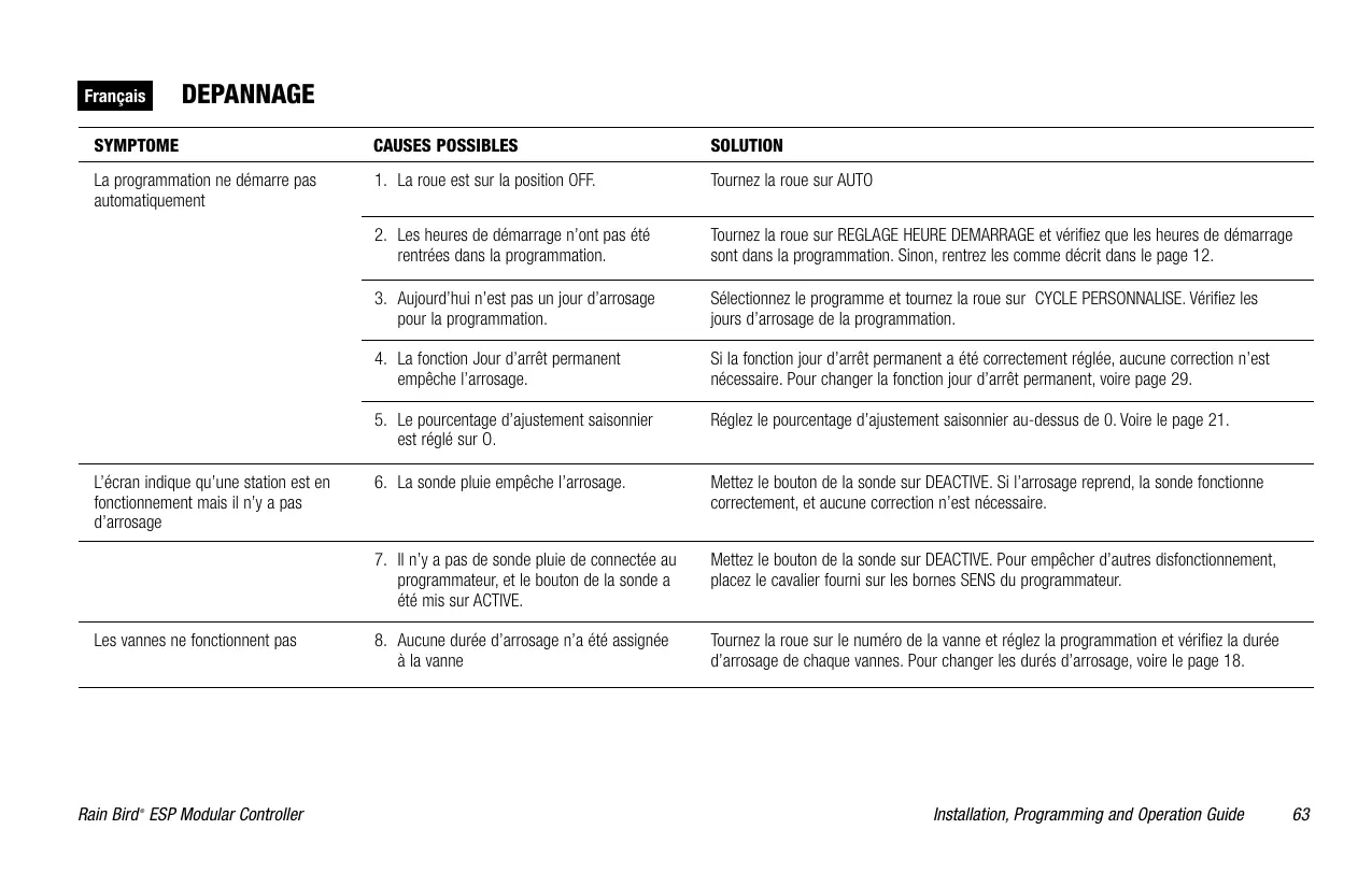 câblage de la vannes a désactivé la station. (La Del d’alarme est allumée) L’écran indique # ERR , où # est le numéro de la station. Identifiez et réparez la panne sur le circuit. Pour effacer l'alarme LED, positionner le cadran à AUTO, ensuite appuyer sur le bouton ADVANCE. 10.La sonde pluie empêche l’arrosage Voir N° 6 11.Les heures de démarrage n’ont pas été rentrées dans la programmation Voir N°2 12.Le pourcentage d’ajustement saisonnier est réglé sur O. Voir N°5 L’écran est partiellement ou complètement noir 13.Une surtension a endommagé l’électronique du programmateur Appuyez sue le bouton RESET. Si la surtension électrique n’a pas provoqué de dommages permanent, le programmateur acceptera normalement une programmation. Si le programmateur ne fonctionne pas correctement, contactez l’Assistance Technique de RAIN BIRD au 800-247-3782 L’arrosage démarre quand il ne devrait pas 14.Le bouton DEMARRAGE MANUEL/ AVANCE a été activé Pour annuler un programme qui a été démarré manuellement, mettez la roue sur OFF pendant 3 secondes. Ensuite remettez la roue sur AUTO 15.Une heure de démarrage non voulue a pu être entrée Tournez la roue sur REGLAGE HEURE DE DEMARRAGE et vérifiez si les programmes n’ont pas une heure de démarrage non voulue. Voire le page 12 pour régler ou éliminer les heures de démarrages