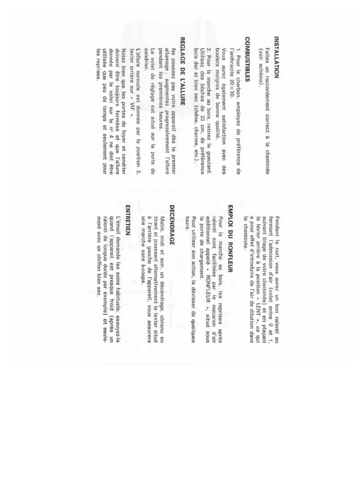 Ouvrez les bûches de 55 cm, de préférence bois dur et bien sec (chêne, châtaignier, etc.). Ne poussez pas votre appareil au premier allumage ; augmentez progressivement l'allure pendant les premières heures. Le volet de réglage est situé sur la porte de cendrier. L'allure normale est donnée par le levier arrière sur * VIF *. Notez bien que les portes de foyer et cendrier doivent être toujours fermées et que l'allure doit être toujours terminée et que l'endroit donné par le volet sur le n° 4 ne doit être utilisée que peu de temps et seulement pour les reprises.