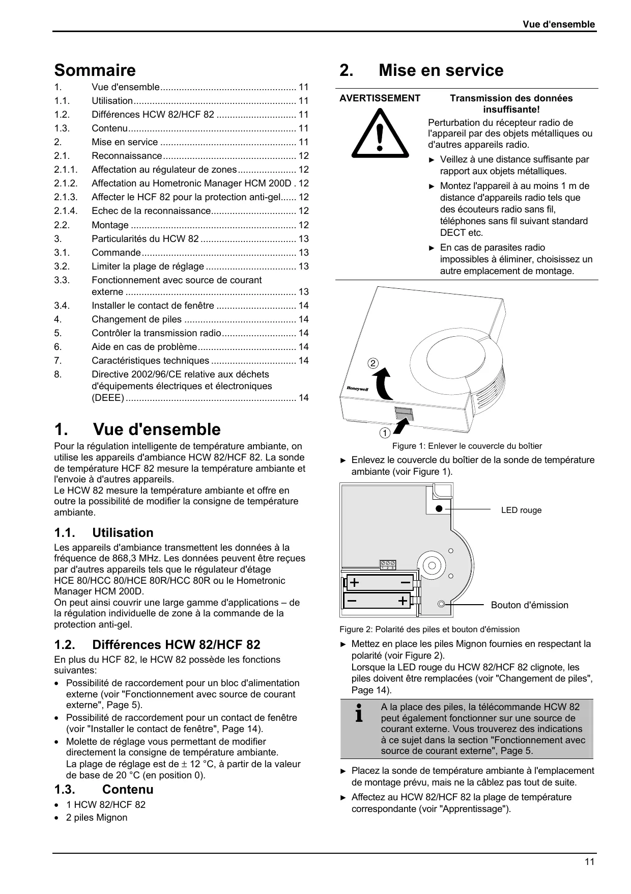 Utilisation 11 Différences HCW 82/HCF 82 11 Contenu 11 Mise en service 11 Reconnaissance 12 Affectation au régulateur de zones 12 Affectation au Hometronic Manager HCM 200D . 12 Affecter le HCF 82 pour la protection anti-gel 12 Echec de la reconnaissance 12 Montage 12 Particularités du HCW 82 13 Commande 13 Limiter la plage de réglage 13 Fonctionnement avec source de courant externe 13 Installer le contact de fenêtre 14 Changement de piles 14 Contrôler la transmission radio 14 Aide en cas de problème 14 Caractéristiques techniques 14 Directive 2002/96/CE relative aux déchets d'équipements électriques et électroniques (DEEE) 14