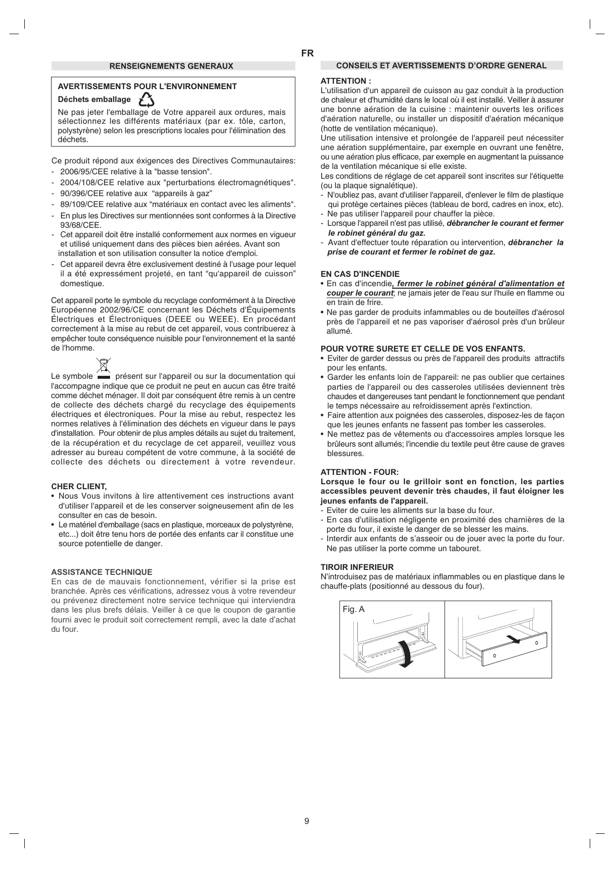 - En cas d'incendie, fermer le robinet général d'alimentation et couper le courant; ne jamais jeter de l'eau sur l'huile en flamme ou en train de frire.