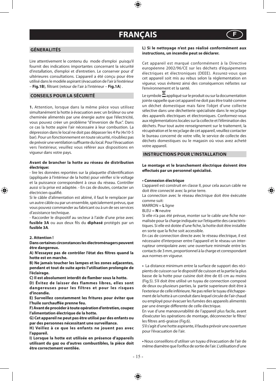 Avant de brancher la hotte au réseau de distribution électrique: - lire les données reportées sur la plaquette d’identification (appliquée à l’intérieur de la hotte) pour vérifier si le voltage et la puissance correspondent à ceux du réseau. Contrôler aussi si la prise est adaptée. - En cas de doutes, contacter un électricien qualifié. Si le câble d’alimentation est abîmé, il faut le remplacer par un autre câble ou par un ensemble, spécialement prévus, que vous pouvez commander au fabricant ou à un de ses services d’assistance technique. - Raccorder le dispositif au secteur à l’aide d’une prise avec fusible 3A ou aux deux fils du diphasé protégés par un fusible 3A. 2. Attention ! Dans certaines circonstances les électroménagers peuvent être dangereux. A) N’essayez pas de contrôler l’état des filtres quand la hotte est en marche. B) Ne jamais toucher les lampes et les zones adjacentes, pendant et tout de suite après l’utilisation prolongée de l’éclairage. C) Il est absolument interdit de flamber sous la hotte. D) Évitez de laisser des flammes libres, elles sont dangereuses pour les filtres et pour les risques d’incendie. E) Surveillez constamment les fritures pour éviter que l’huile surchauffée prenne feu. F) Avant de procéder à toute opération d’entretien, coupez l’alimentation électrique de la hotte. G) Cet appareil ne peut pas être utilisé par des enfants ou par des personnes nécessitant une surveillance. H) Veillez à ce que les enfants ne jouent pas avec l’appareil. I) Lorsque la hotte est utilisée en présence d’appareils utilisant du gaz ou d’autres combustibles, la pièce doit être correctement ventilée.