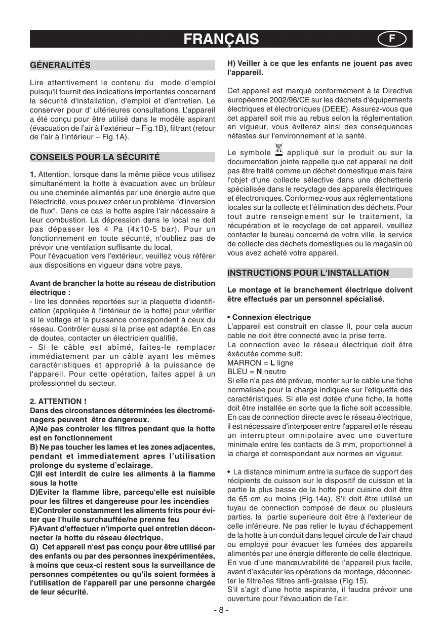 Lire attentivement le content du mode d'emploi puisqu'il fournit des indications importantes concernant la sécurité d'installation, d'emploi et d'entretien. Le conserver pour d'ultérieures consultations. L'appareil a eté concu pour être utilisé dans le modele aspirant (evacuation de l'air à l'extérieur - Fig.1B), filtrant (retour de l'air à l'intérieur - Fig.1A).