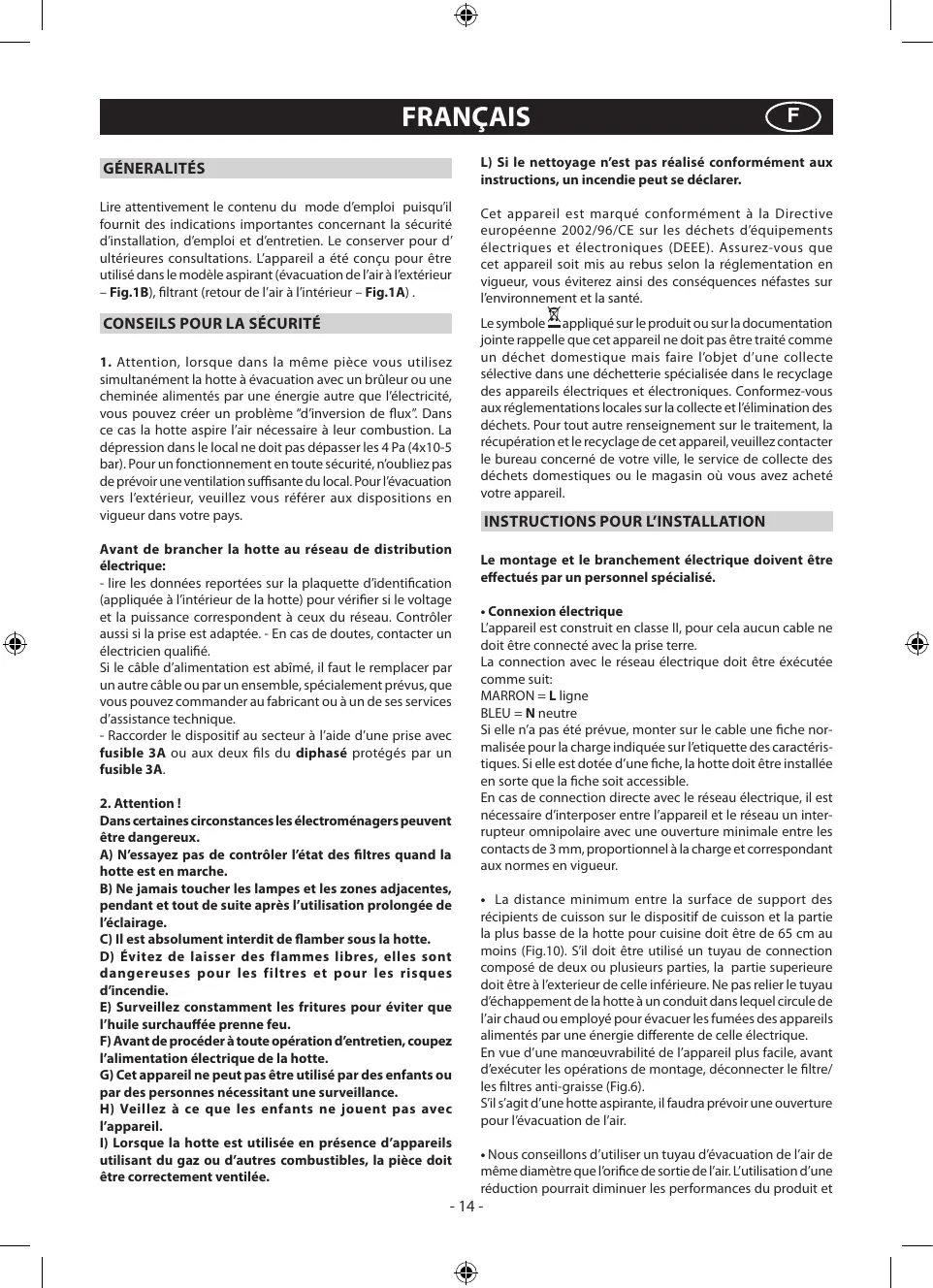 Avant de brancher la hotte au réseau de distribution électrique: - lire les données reportées sur la plaquette d’identification (appliquée à l’intérieur de la hotte) pour vérifier si le voltage et la puissance correspondent à ceux du réseau. Contrôler aussi si la prise est adaptée. - En cas de doutes, contacter un électricien qualifié. Si le câble d’alimentation est abîmé, il faut le remplacer par un autre câble ou par un ensemble, spécialement prévus, que vous pouvez commander au fabricant ou à un de ses services d’assistance technique. - Raccorder le dispositif au secteur à l’aide d’une prise avec fusible 3A ou aux deux fils du diphasé protégés par un fusible 3A. 2. Attention ! Dans certaines circonstances les électroménagers peuvent être dangereux. A) N’essayez pas de contrôler l’état des filtres quand la hotte est en marche. B) Ne jamais toucher les lampes et les zones adjacentes, pendant et tout de suite après l’utilisation prolongée de l’éclairage. C) Il est absolument interdit de flamber sous la hotte. D) Évitez de laisser des flammes libres, elles sont dangereuses pour les filtres et pour les risques d’incendie. E) Surveillez constamment les fritures pour éviter que l’huile surchauffée prenne feu. F) Avant de procéder à toute opération d’entretien, coupez l’alimentation électrique de la hotte. G) Cet appareil ne peut pas être utilisé par des enfants ou par des personnes nécessitant une surveillance. H) Veillez à ce que les enfants ne jouent pas avec l’appareil. I) Lorsque la hotte est utilisée en présence d’appareils utilisant du gaz ou d’autres combustibles, la pièce doit être correctement ventilée.