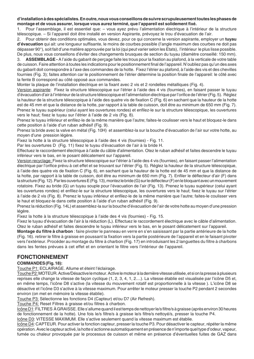 d’évacuation qui ait: une longueur suffisante, le moins de courbes possible (l’angle maximum des courbes ne doit pas dépasser 90°), soit fait d’une matière approuvée par la loi (qui peut varier selon les Etats), l’intérieur le plus lisse possible. De plus, nous vous conseillons d’éviter des changements brusques de section du tuyau (diamètre conseillé: 150 mm). 3. ASSEMBLAGE - A l’aide du gabarit de perçage faite les trous pour la fixation au plafond, à la verticale de votre table de cuisson. Faire attention à toutes les indications pour le positionnement final de l’appareil. N’oubliez pas qu’un des axes du gabarit doit correspondre à l’axe des commandes de la hotte. Fixez l’étrier au plafond, à l’aide des vis et des chevilles fournies (Fig. 3); faites attention car le positionnement de l’étrier détermine la position finale de l’appareil: le côté avec la fente B correspond au côté opposé aux commandes. Monter la plaque de l’installation électrique en la fixant avec 2 vis et 2 rondelles métalliques (Fig. 4). Version aspirante: Fixez la structure télescopique sur l’étrier à l’aide des 4 vis (fournies), en faisant passer le tuyau d’évacuation d’air à l’intérieur de la structure télescopique et l’alimentation électrique par l’orifice de l’étrier (Fig. 5). Réglez la hauteur de la structure télescopique à l’aide des quatre vis de fixation C (Fig. 6) en sachant que la hauteur de la hotte est de 45 mm et que la distance de la hotte, par rapport à la table de cuisson, doit être au minimum de 650 mm (Fig. 7). Prenez le tuyau supérieur (celui ayant les ouvertures rondes) et enfilez-le sur la structure télescopique, les ouvertures vers le haut; fixez le tuyau sur l’étrier à l’aide de 2 vis (Fig. 8). Prenez le tuyau inférieur et enfilez-le de la même manière que l’autre; faites-le coulisser vers le haut et bloquez-le dans cette position à l’aide d’un ruban adhésif (Fig. 9). Prenez la bride avec la valve en métal (Fig. 10H) et assemblez-la sur la bouche d’évacuation de l’air sur votre hotte, au moyen d’une pression légère. Fixez la hotte à la structure télescopique à l’aide des 4 vis (fournies) - Fig. 11. Par les ouvertures D (Fig. 11) fixez le tuyau d’évacuation de l’air à la bride H. Effectuez le raccordement électrique à l’aide du câble d’alimentation. Otez le ruban adhésif et faites descendre le tuyau inférieur vers le bas, en le posant délicatement sur l’appareil. Version recyclage: Fixez la structure télescopique sur l’étrier à l’aide des 4 vis (fournies), en faisant passer l’alimentation électrique par l’orifice prévu à cet effet et se trouvant sur l’étrier (Fig. 5). Réglez la hauteur de la structure télescopique, à l’aide des quatre vis de fixation C (Fig. 6), en sachant que la hauteur de la hotte est de 45 mm et que la distance de la hotte, par rapport à la table de cuisson, doit être au minimum de 650 mm (Fig. 7). Enfiler le déflecteur d’air (F) dans la structure (Fig. 12). Par les ouvertures E (Fig. 13), montez le bride (G) sur le déflecteur (F) en le bloquant avec un mouvement rotatoire. Fixez au bride (G) un tuyau souple pour l’évacuation de l’air (Fig. 13). Prenez le tuyau supérieur (celui ayant les ouvertures rondes) et enfilez-le sur la structure télescopique, les ouvertures vers le haut; fixez le tuyau sur l’étrier à l’aide de 2 vis (Fig. 8). Prenez le tuyau inférieur et enfilez-le de la même manière que l’autre; faites-le coulisser vers le haut et bloquez-le dans cette position à l’aide d’un ruban adhésif (Fig. 9). Prenez la réduction (Fig. 14L) et assemblez-la sur la bouche d’évacuation de l’air de votre hotte au moyen d’une pression légère. Fixez la hotte à la structure télescopique à l’aide des 4 vis (fournies) - Fig. 15. Fixez le tuyau d’évacuation de l’air à la réduction (L). Effectuez le raccordement électrique avec le câble d’alimentation. Otez le ruban adhésif et faites descendre le tuyau inférieur vers le bas, en le posant délicatement sur l’appareil. Montage du filtre à charbon : faire pivoter le panneau en verre en s’en saisissant par la partie antérieure de la hotte (Fig. 16). retirer le filtre à graisse en poussant la fixation vers la partie postérieure de l’appareil et en le faisant pivoter vers l’extérieur. Procéder au montage du filtre à charbon (Fig. 17) en introduisant les 2 languettes du filtre à charbons dans les fentes prévues à cet effet et en orientant le filtre vers l’intérieur de l’appareil. FONCTIONNEMENT COMMANDES (Fig. 18): Touche P1: ECLAIRAGE. Allume et éteint l’éclairage. Touche P2: MOTEUR. Active/Désactive le moteur. Active le moteur à la dernière vitesse utilisée, et si on la presse à plusieurs reprises elle change la vitesse de façon cyclique (1, 2, 3, 4, 1, 2....). La vitesse établie est visualisée par l’icône D5 et, en même temps, l’icône D8 s’active (la vitesse du mouvement rotatif est proportionnelle à la vitesse ). L’icône D8 se désactive et l’icône D3 s’active à la vitesse maximum. Pour arrêter le moteur presser la touche P2 pendant 2 secondes environ (on met en mémoire la vitesse établie). Touche P3: Sélectionne les fonctions D4 (Capteur) et/ou D7 (Air Refresh). Touche P4: Reset Filtres à graisse et/ou filtres à charbon. Icône D1: FILTRES À GRAISSE. Elle s’allume quand il est temps de nettoyer le/s filtre/s à graisse (après environ 30 heures de fonctionnement de la hotte). Une fois le/s filtre/s à graisse le/s filtre/s nettoyé/s, presser la touche P4. Icône D3: VITESSE MAXIMUM. Elle s’active seulement quand la vitesse maximum est établie. Icône D4: CAPTEUR. Pour activer la fonction capteur, presser la touche P3. Pour désactiver le capteur, répéter la même opération. Avec le capteur activé, la hotte s’actionne automatiquement en présence de n’impo