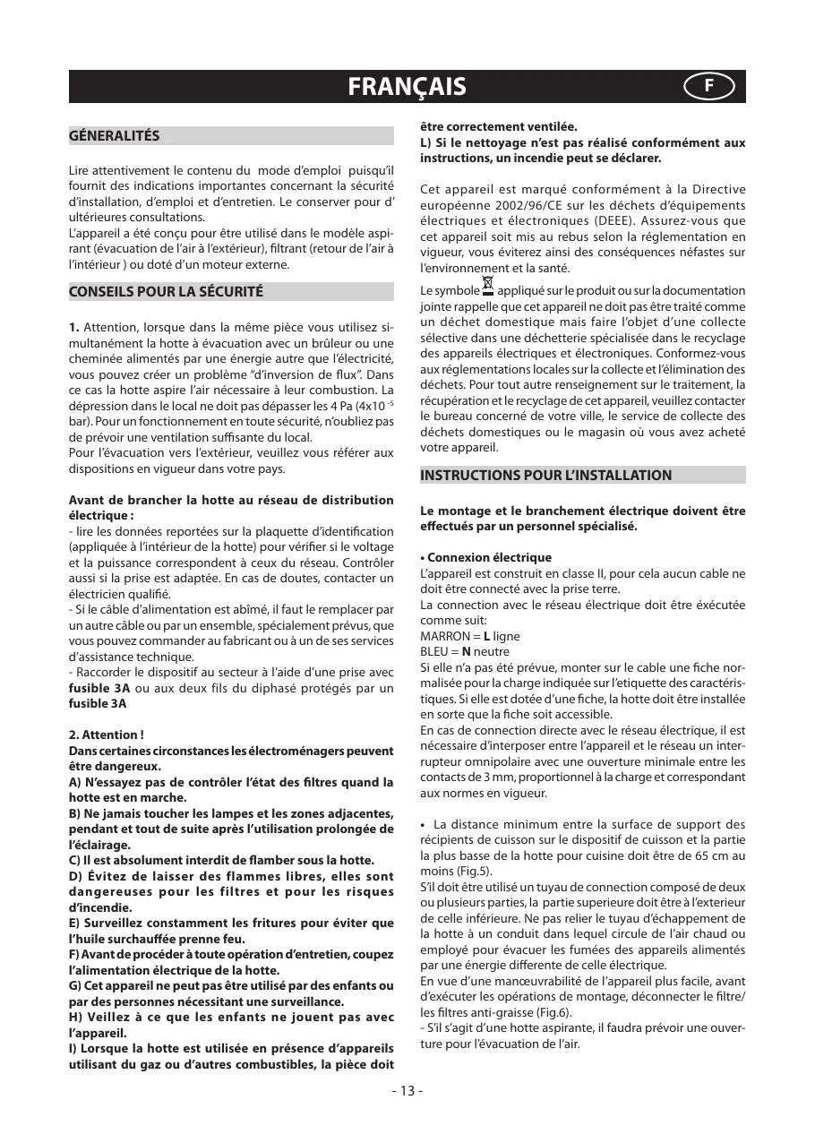 cheminée alimentés par une énergie autre que l’électricité, vous pouvez créer un problème “d’inversion de flux”. Dans ce cas la hotte aspire l’air nécessaire à leur combustion. La dépression dans le local ne doit pas dépasser les 4 Pa (4x10 -5 bar). Pour un fonctionnement en toute sécurité, n’oubliez pas de prévoir une ventilation suffisante du local. Pour l’évacuation vers l’extérieur, veuillez vous référer aux dispositions en vigueur dans votre pays. Avant de brancher la hotte au réseau de distribution électrique : - lire les données reportées sur la plaquette d’identification (appliquée à l’intérieur de la hotte) pour vérifier si le voltage et la puissance correspondent à ceux du réseau. Contrôler aussi si la prise est adaptée. En cas de doutes, contacter un électricien qualifié. - Si le câble d’alimentation est abîmé, il faut le remplacer par un autre câble ou par un ensemble, spécialement prévus, que vous pouvez commander au fabricant ou à un de ses services d’assistance technique. - Raccorder le dispositif au secteur à l’aide d’une prise avec fusible 3A ou aux deux fils du diphasé protégés par un fusible 3A