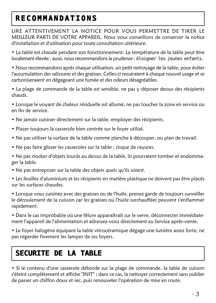 RECOMMANDATIONS LIRE ATTENTIVEMENT LA NOTICE POUR VOUS PERMETTRE DE TIRER LE MEILLEUR PARTI DE VOTRE APPAREIL. Nous vous conseillons de conserver la notice d'installation et d'utilisation pour toute consultation ultérieure. La table est chaude pendant son fonctionnement. La température de la table peut être localement élevée ; aussi, nous recommandons la prudence : éloigner les jeunes enfants. Nous recommandons après chaque utilisation, un petit nettoyage de la table, pour éviter l'accumulation des salissures et des graisses. Celles-ci recuiraient à chaque nouvel usage et se carboniseraient en dégageant une fumée et des odeurs désagréables. La plage de commande de la table est sensible, ne pas y déposer dessus des récipients chauds. Lorsque le voyant de chaleur résiduelle est allumé, ne pas toucher la zone en service ou en fin de service. Ne jamais cuisiner directement sur la table, employer des récipients. Placer toujours la casserole bien centrée sur le foyer utilisé. Ne pas utiliser la surface de la table comme planche à découper, ou plan de travail. Ne pas faire glisser les casseroles sur la table : risque de rayures. Ne pas stocker d'objets lourds au dessus de la table, ils pourraient tomber et endommager la table. Ne pas entreposer sur la table des objets quels qu'ils soient. Les feuilles d'aluminium et les récipients en matière plastique ne doivent pas être placés sur les surfaces chaudes. Lorsque vous cuisinez avec des graisses ou de l'huile, prenez garde de toujours surveiller le déroulement de la cuisson car les graisses ou l'huile surchauffées peuvent s'enflammer rapidement. Dans le cas improbable où une fêlure apparaîtrait sur le verre, déconnecter immédiatement l'appareil de l'alimentation et adressez-vous directement au Service après-vente. Le foyer halogène équipant la table vitrocéramique dégage une lumière assez forte, ne pas regarder fixement les lampes de ces foyers.