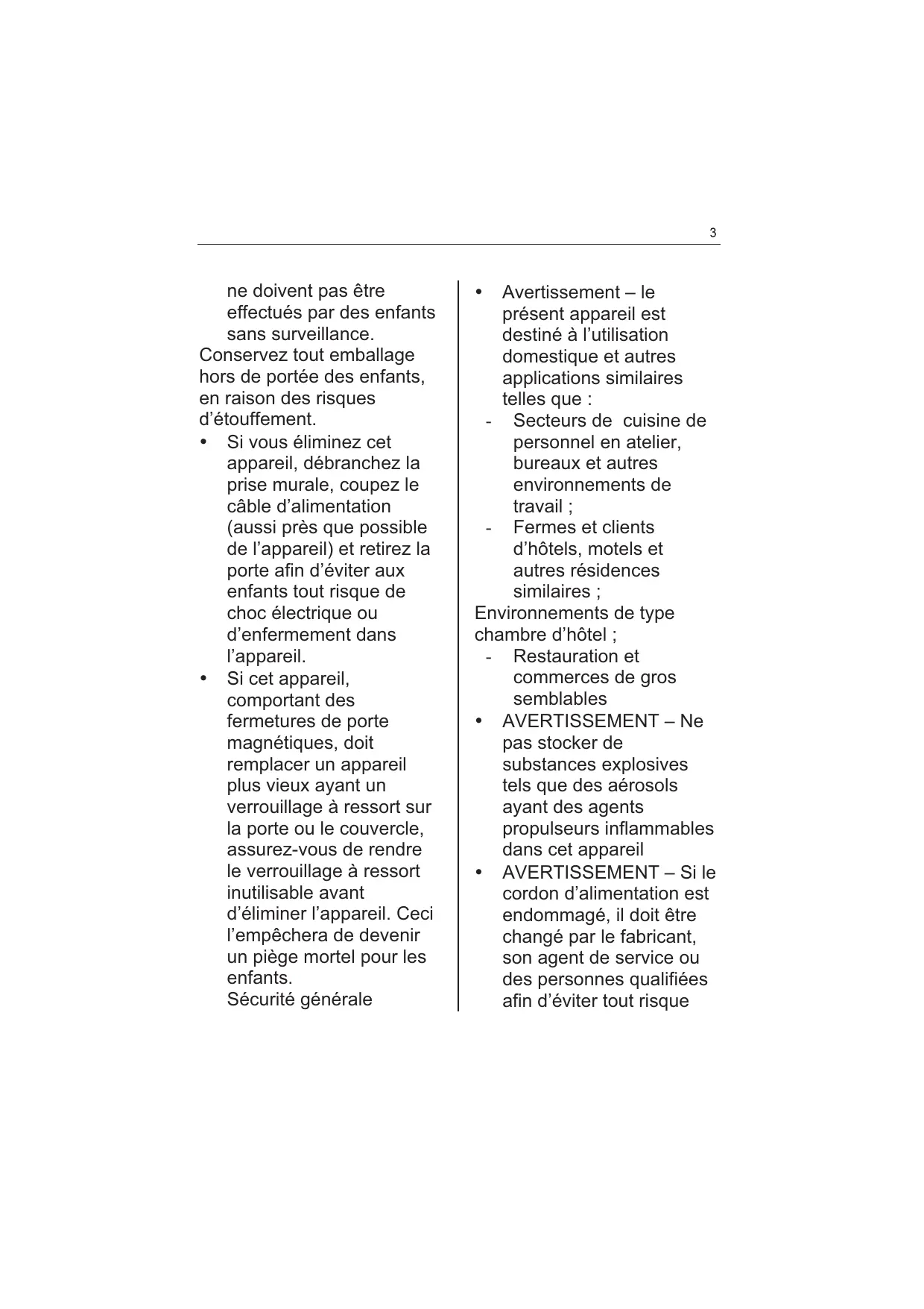 - Elimination de l’appareil Le présent appareil est conforme aux directives suivantes de l’UE : 2006 / 95 / EC et 2004 / 108 / EC et 2009 / 125 / EC et EC 643 / 2009 et 2002 / 95 / EC Pour votre sécurité et une utilisation correcte, avant d’installer et d’utiliser l’appareil pour la première fois, veuillez soigneusement lire le présent mode d’emploi, notamment les conseils et astuces. Pour éviter toute erreur et accident inutiles, il est important de s’assurer que toutes les personnes utilisant l’appareil sont bien familiarisées avec son fonctionnement et ses caractéristiques de sécurité. Veuillez conserver le présent mode d’emploi et vous assurer qu’il reste avec l’appareil s’il est déplacé ou vendu, afin que toute personne l’utilisant au cours de sa durée de vie, soit correctement informée de son utilisation et de ses règles de sécurité. Pour la sécurité et l’appareil, veuillez respecter les précautions contenues dans le mode d’emploi, le fabricant n’est pas responsable des dommages provoqués par toute omission. Sécurité des enfants et autres personnes vulnérables x Cet appareil peut être utilisé par des enfants de 8 ans et plus et les personnes ayant des capacités physiques, sensorielles ou mentales diminuées, si elles sont sous surveillance et ont reçu des instructions concernant l’utilisation sure, et comprennent les risques encourus. Les enfants ne doivent pas jouer avec cet appareil. Le nettoyage et l’entretien ne doivent pas être effectués par des enfants sans surveillance. Conservez tout emballage hors de portée des enfants, en raison des risques d’étouffement. x Si vous éliminez cet appareil, débranchez la prise murale, coupez le câble d’alimentation (aussi près que possible de l’appareil) et retirez la porte afin d’éviter aux enfants tout risque de choc électrique ou d’enfermement dans l’appareil. x Si cet appareil, comportant des fermetures de porte magnétiques, doit remplacer un appareil plus vieux ayant un verrouillage à ressort sur la porte ou le couvercle, assurez-vous de rendre le verrouillage à ressort inutilisable avant d’éliminer l’appareil. Ceci l’empêchera de devenir un piège mortel pour les enfants. Sécurité générale Avertissement – le présent appareil est destiné à l’utilisation domestique et autres applications similaires telles que : - Secteurs de cuisine de personnel en atelier, bureaux et autres environnements de travail ; - Fermes et clients d’hôtels, motels et autres résidences similaires ; Environnements de type chambre d’hôtel ; - Restauration et commerces de gros semblables x AVERTISSEMENT – Ne pas stocker de substances explosives tels que des aérosols ayant des agents propulseurs inflammables dans cet appareil x AVERTISSEMENT – Si le cordon d’alimentation est endommagé, il doit être changé par le fabricant, son agent de service ou des personnes qualifiées afin d’éviter tout risque p. 17