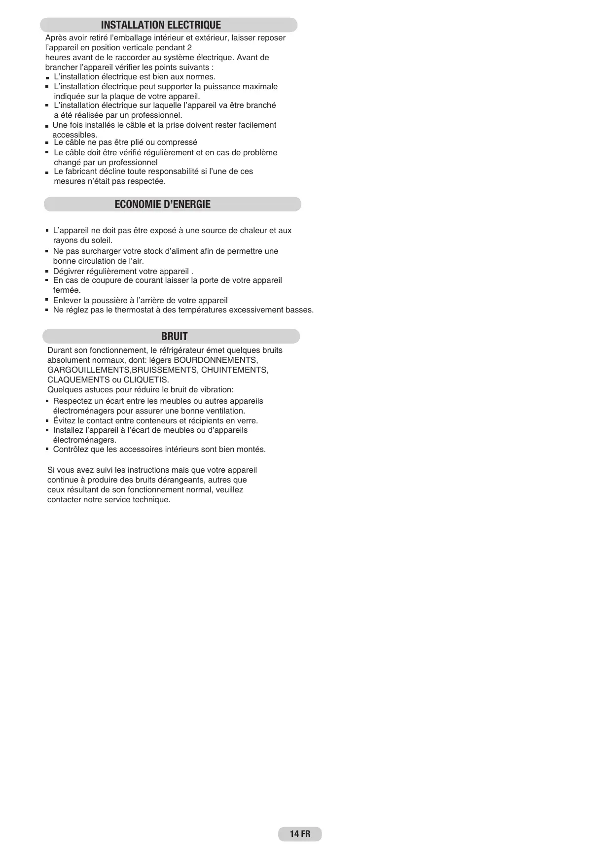 L’appareil ne doit pas être exposé à une source de chaleur et aux rayons du soleil. Ne pas surcharger votre stock d’aliment afin de permettre une bonne circulation de l’air. Dégivrer régulièrement votre appareil . En cas de coupure de courant laisser la porte de votre appareil fermée. Enlever la poussière à l’arrière de votre appareil Ne réglez pas le thermostat à des températures excessivement basses. BRUIT Durant son fonctionnement, le réfrigérateur émet quelques bruits absolument normaux, dont: légers BOURDONNEMENTS, GARGOUILLEMENTS,BRUISSEMENTS, CHUINTEMENTS, CLAQUEMENTS ou CLIQUETIS. Quelques astuces pour réduire le bruit de vibration: Respectez un écart entre les meubles ou autres appareils électroménagers pour assurer une bonne ventilation. Évitez le contact entre conteneurs et récipients en verre. Installez l’appareil à l’écart de meubles ou d’appareils électroménagers. Contrôlez que les accessoires intérieurs sont bien montés. Si vous avez suivi les instructions mais que votre appareil continue à produire des bruits dérangeants, autres que ceux résultant de son fonctionnement normal, veuillez contacter notre service technique. 14 FR ENTRETIEN L’entretien correct de l’appareil garantit sa longévité. Ne pas oublier pas de débrancher la prise avant toute opération. Nettoyage Nettoyer périodiquement l’extérieur du réfrigérateur avec un chiffon humide, et l’intérieur avec une solution de bicarbonate de soude ; éviter d’utiliser des produits abrasifs. Le centre de la paroi de fond du réfrigérateur est pourvu d’un trou d’évacuation de l’eau, qu’il est important de ne pas boucher et de nettoyer périodiquement. Dégivrage Dans les produits sans technologie NO FROST, il est recommandé de dégivrer le réfrigérateur chaque fois qu’une couche de givre se forme. Pour accélérer le processus de dégivrage, laisser les portes ouvertes avec l’appareil éteint. Pour retirer la glace sur les éléments internes, éviter d’utiliser des objets tranchants ou mécaniques (couteaux, ciseaux ou toute autre méthode différente de celle recommandée par le fabricant) afin de ne pas endommager le circuit réfrigérant. ATTENTION : la présence de gouttes de givre sur la paroi du fond du compartiment réfrigérateur est normale, à condition que leur quantité ne soit pas excessive. Remplacement de la LED Le réfrigérateur est équipé d’une ampoule LED qui a durée de vie supérieure à celle d’une ampoule classique. Pour la changer, se rapprocher du centre technique.