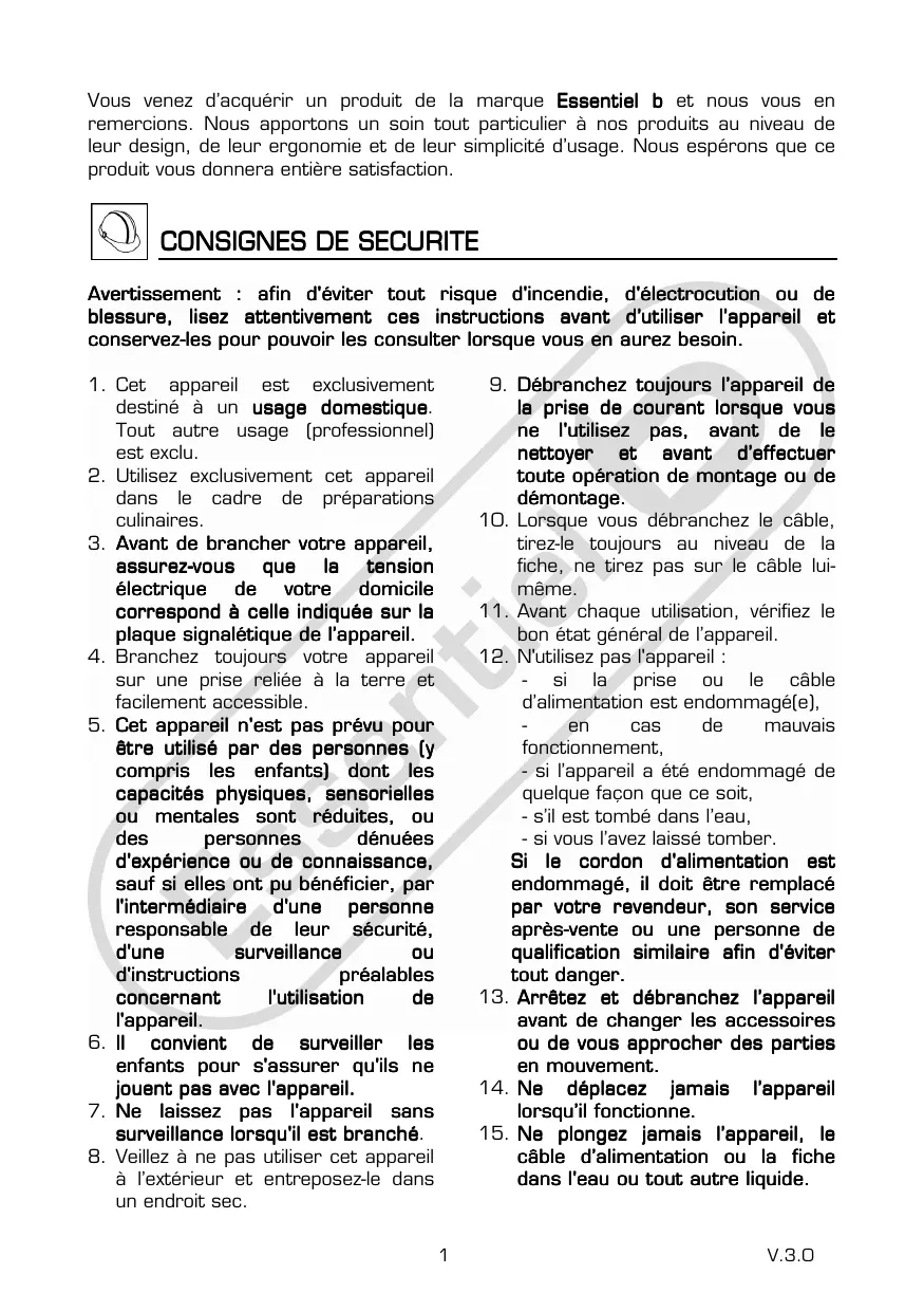 V.3.0 le couvercle. L’appareil est conçu pour la préparation de petites quantités de nourriture dont la consommation ne doit pas être trop tardive. L’appareil n’est pas conçu pour la préparation de grandes quantités à la fois. Ne touchez jamais la lame lorsque l’appareil est en fonctionnement ; en outre, n’essayez pas de l’immobiliser de quelque façon que ce soit. N’utilisez pas l’appareil sans nourriture à l’intérieur du bol mélangeur. Intervalles d’utilisation Cet appareil ne peut fonctionner de façon continue, il ne s’agit s’agit pas d’un appareil de type professionnel. Vous devez respecter des d es pauses de fonctionnement. Dans le cas contraire, contraire, vous risqueriez d’endommager le moteur. Référez-vous à la plaque signalétique de votre appareil pour connaître la durée maximale d’utilisation continue (notée « KB xx min » où xx est la durée maximale). Les pauses de fonctionnement doivent durer au moins 10 minutes. CARACTERISTIQUES TECHNIQUES TECHNIQUES Puissance : 700 Watts Alimentation : 220-240 V~ 50 Hz 1 bol en verre gradué d’une capacité totale de 1,5 litre Bouton marche/arrêt et variateur de vitesse rétro-éclairé 3 touches de fonction : « Smoothie », « Ice » et « Pulse » Couteau 6 lames (dont 2 crantées) Base en inox Bouchon de sécurité : l’air chaud s’échappe par le bouchon Pieds antidérapants