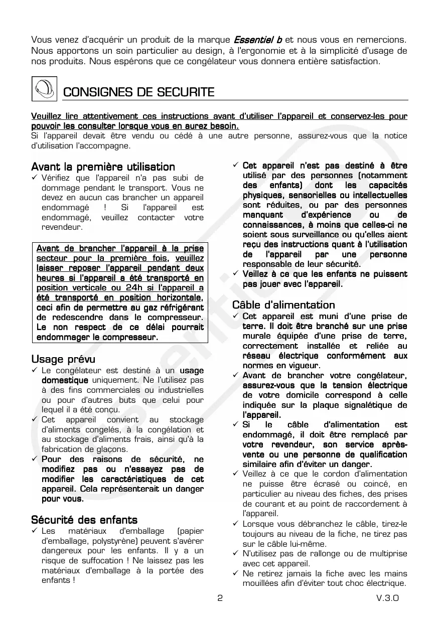 Vouse venez d'acquerir un produit de la marque Essentiel b et nous vous en remercions. Nous apportons un soin particulier au design, à l'ergonomie et à la simplicité d'utilisation de nos produits. Nous espérons que ce congelateur vous donnera entière satisfaction.