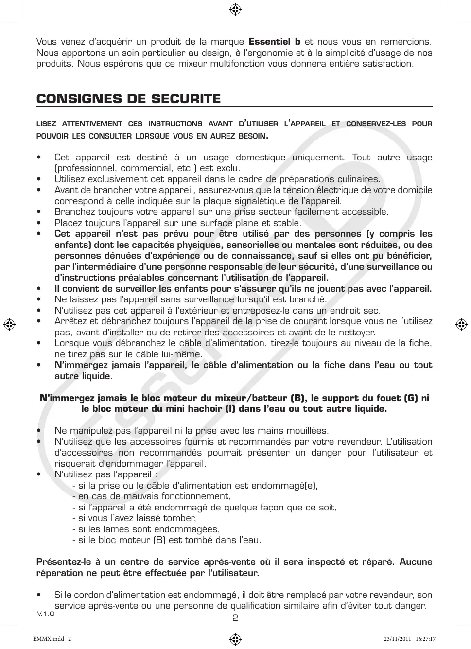 Vou venez d'acquérir un produit de la marque Essentiel b et nous vous en remercions. Nous apportons unsoon particulier au design, à l'ergonomie et à la simplicité d'usage de nos produits. Nous espérons que ce mixeur multifonction vous donnera entière satisfaction.