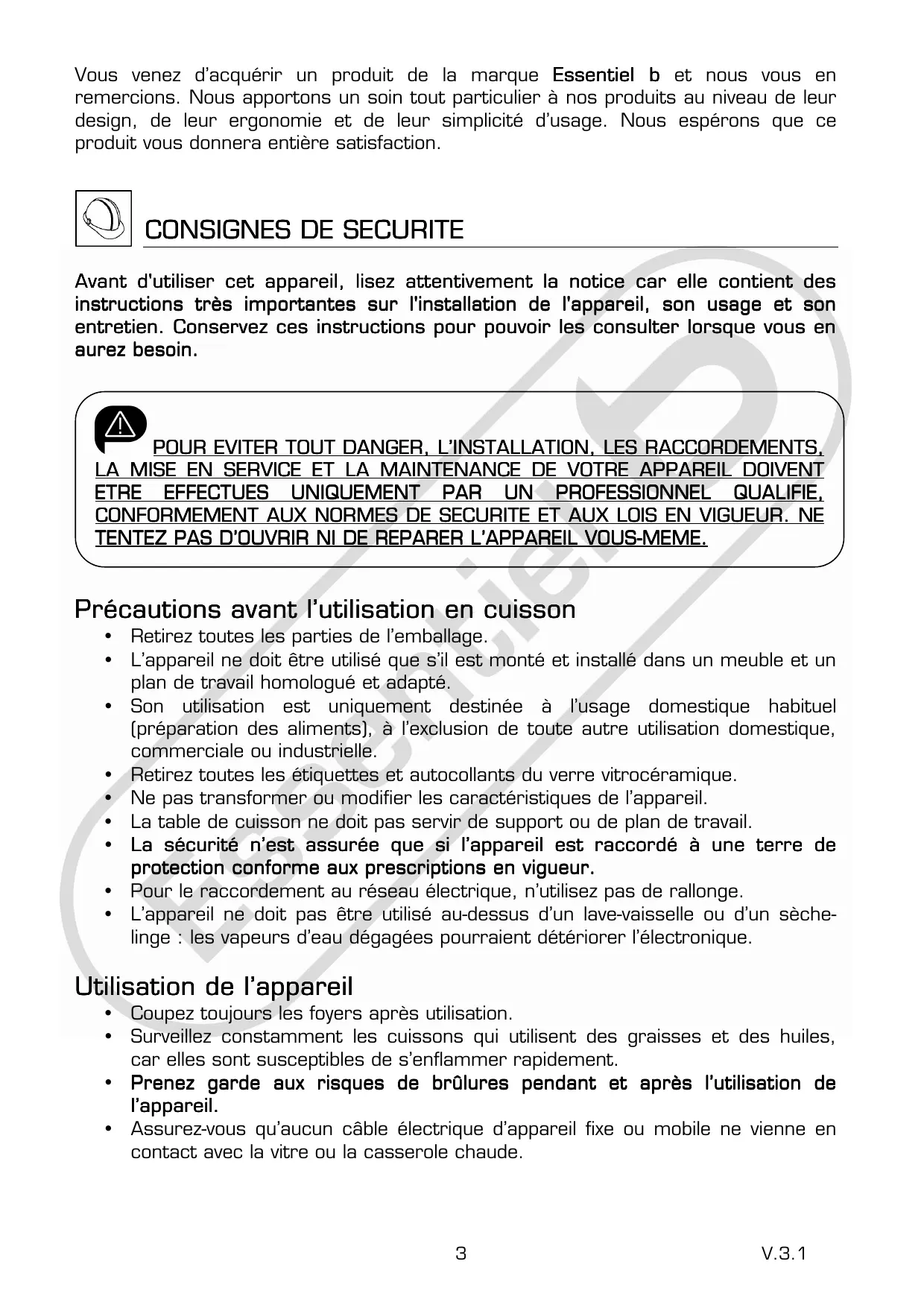Vouse venez d'acquérir un produit de la marque Essentiel b et nous vous en remercions. Nous apportons un soin tout particulier à nos produits au niveau de leur design, de leur ergonomie et de leur simplicité d'utilisation. Nous espérons que ce produit vous donnera entière satisfaction.