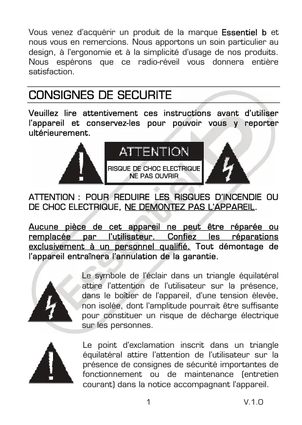 Vous venez d'acquérir un produit de la marque Essentiel b et nous vous en remercions. Nous apportons un soin particulier au design, à l'ergonomie et à la simplicité d'usage de nos produits. Nous espérons que ce radio-réveil vous donnera entière satisfaction.