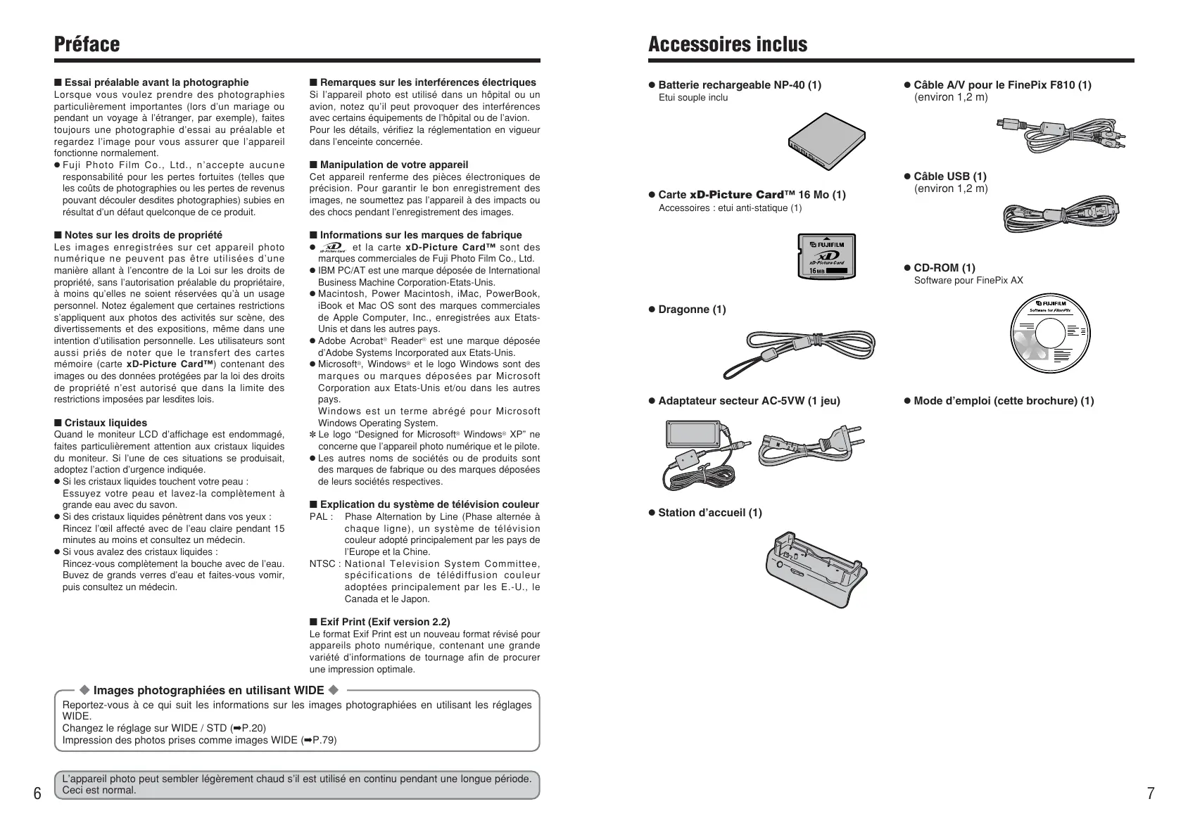 ■ Cristaux liquides Quand le moniteur LCD d’affichage est endommagé, faites particulièrement attention aux cristaux liquides du moniteur. Si l’une de ces situations se produisait, adoptez l’action d’urgence indiquée. h Si les cristaux liquides touchent votre peau : Essuyez votre peau et lavez-la complètement à grande eau avec du savon. h Si des cristaux liquides pénètrent dans vos yeux : Rincez l’œil affecté avec de l’eau claire pendant 15 minutes au moins et consultez un médecin. h Si vous avalez des cristaux liquides : Rincez-vous complètement la bouche avec de l’eau. Buvez de grands verres d’eau et faites-vous vomir, puis consultez un médecin. h Batterie rechargeable NP-40 (1) Etui souple inclu ■ Manipulation de votre appareil Cet appareil renferme des pièces électroniques de précision. Pour garantir le bon enregistrement des images, ne soumettez pas l’appareil à des impacts ou des chocs pendant l’enregistrement des images. et la carte xD-Picture Card™ sont des marques commerciales de Fuji Photo Film Co., Ltd. h IBM PC/AT est une marque déposée de International Business Machine Corporation-Etats-Unis. h Macintosh, Power Macintosh, iMac, PowerBook, iBook et Mac OS sont des marques commerciales de Apple Computer, Inc., enregistrées aux EtatsUnis et dans les autres pays. h Adobe Acrobat® Reader® est une marque déposée d’Adobe Systems Incorporated aux Etats-Unis. h Microsoft®, Windows® et le logo Windows sont des marques ou marques déposées par Microsoft Corporation aux Etats-Unis et/ou dans les autres pays. Windows est un terme abrégé pour Microsoft Windows Operating System. ✽ Le logo “Designed for Microsoft® Windows® XP” ne concerne que l’appareil photo numérique et le pilote. h Les autres noms de sociétés ou de produits sont des marques de fabrique ou des marques déposées de leurs sociétés respectives. ■ Explication du système de télévision couleur PAL : Phase Alternation by Line (Phase alternée à chaque ligne), un système de télévision couleur adopté principalement par les pays de l’Europe et la Chine. NTSC : National Television System Committee, spécifications de télédiffusion couleur adoptées principalement par les E.-U., le Canada et le Japon. h Carte xD-Picture Card™ 16 Mo (1) h Câble A/V pour le FinePix F810 (1) (environ 1,2 m) h Câble USB (1) (environ 1,2 m) Accessoires : etui anti-statique (1) h CD-ROM (1) Software pour FinePix AX h Dragonne (1) h Adaptateur secteur AC-5VW (1 jeu) h Mode d’emploi (cette brochure) (1) h Station d’accueil (1) ■ Exif Print (Exif version 2.2) Le format Exif Print est un nouveau format révisé pour appareils photo numérique, contenant une grande variété d’informations de tournage afin de procurer une impression optimale. ◆ Images photographiées en utilisant WIDE ◆ Reportez-vous à ce qui suit les informations sur les images photographiées en utilisant les réglages WIDE. Changez le réglage sur WIDE / STD (➡P.20) Impression des photos prises comme images WIDE (➡P.79)