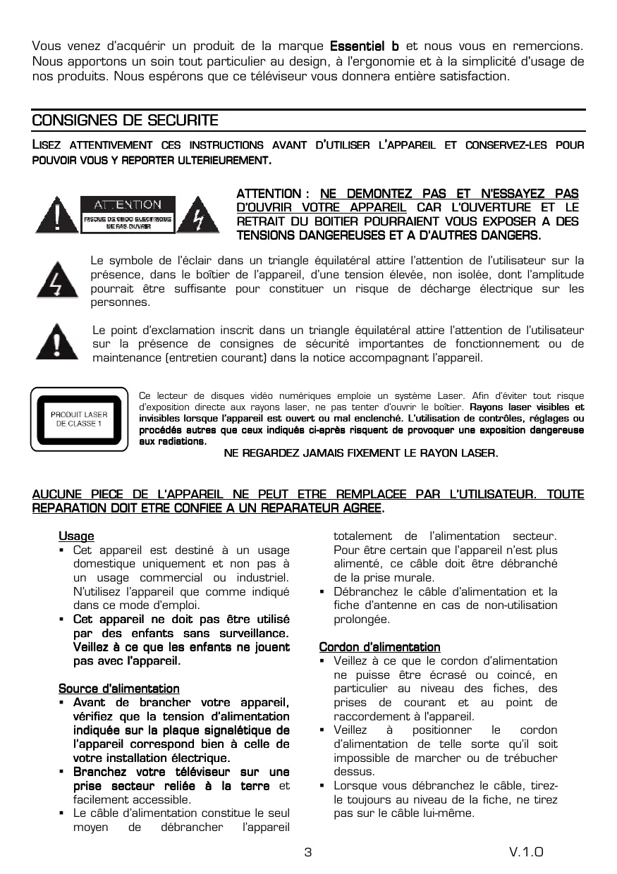 TENSIONS DANGEREUSES ET A D’AUTRES DANGERS. DANGERS. Le symbole de l’éclair dans un triangle équilatéral attire l’attention de l’utilisateur sur la présence, dans le boîtier de l’appareil, d’une tension élevée, non isolée, dont l’amplitude pourrait être suffisante pour constituer un risque de décharge électrique sur les personnes. Le point d’exclamation inscrit dans un triangle équilatéral attire l’attention de l’utilisateur sur la présence de consignes de sécurité importantes de fonctionnement ou de maintenance (entretien courant) dans la notice accompagnant l’appareil. Ce lecteur de disques vidéo numériques emploie un système Laser. Afin d’éviter tout risque d’exposition directe aux rayons laser, ne pas tenter d’ouvrir le boîtier. Rayons laser visibles et invisibles lorsque l’appareil est ouvert ou mal enclenché. L’utilisation de contrôles, réglages ou procédés autres que ceux indiqués cici -après risquent de provoquer une exposition dangereuse aux radiations. NE REGARDEZ JAMAIS FIXEMENT LE RAYON LASER. AUCUNE PIECE DE L’APPAREIL NE PEUT ETRE REMPLACEE PAR L’UTILISATEUR. TOUTE REPARATION DOIT ETRE CONFIEE A UN REPARATEUR AGREE. AGREE. Usage Cet appareil est destiné à un usage domestique uniquement et non pas à un usage commercial ou industriel. N’utilisez l’appareil que comme indiqué dans ce mode d’emploi. Cet appareil ne doit pas être utilisé par des enfants sans surveillance. Veillez à ce que les enfants ne jouent pas avec avec l'appareil. totalement de l’alimentation secteur. Pour être certain que l’appareil n’est plus alimenté, ce câble doit être débranché de la prise murale. Débranchez le câble d’alimentation et la fiche d’antenne en cas de non-utilisation prolongée. Cordon d’alimentation Veillez à ce que le cordon d’alimentation ne puisse être écrasé ou coincé, en particulier au niveau des fiches, des prises de courant et au point de raccordement à l'appareil. Veillez positionner cordon d’alimentation de telle sorte qu’il soit impossible de marcher ou de trébucher dessus. Lorsque vous débranchez le câble, tirezle toujours au niveau de la fiche, ne tirez pas sur le câble lui-même. Source d'alimentation Avant de brancher votre appareil, vérifiez que la tension d’alimentation indiquée sur la plaque signalétique signal étique de l’appareil correspond bien à celle de votre installation électrique. Branchez votre téléviseur sur une prise pris e secteur reliée à la terre et facilement accessible. Le câble d’alimentation constitue le seul moyen débrancher l’appareil